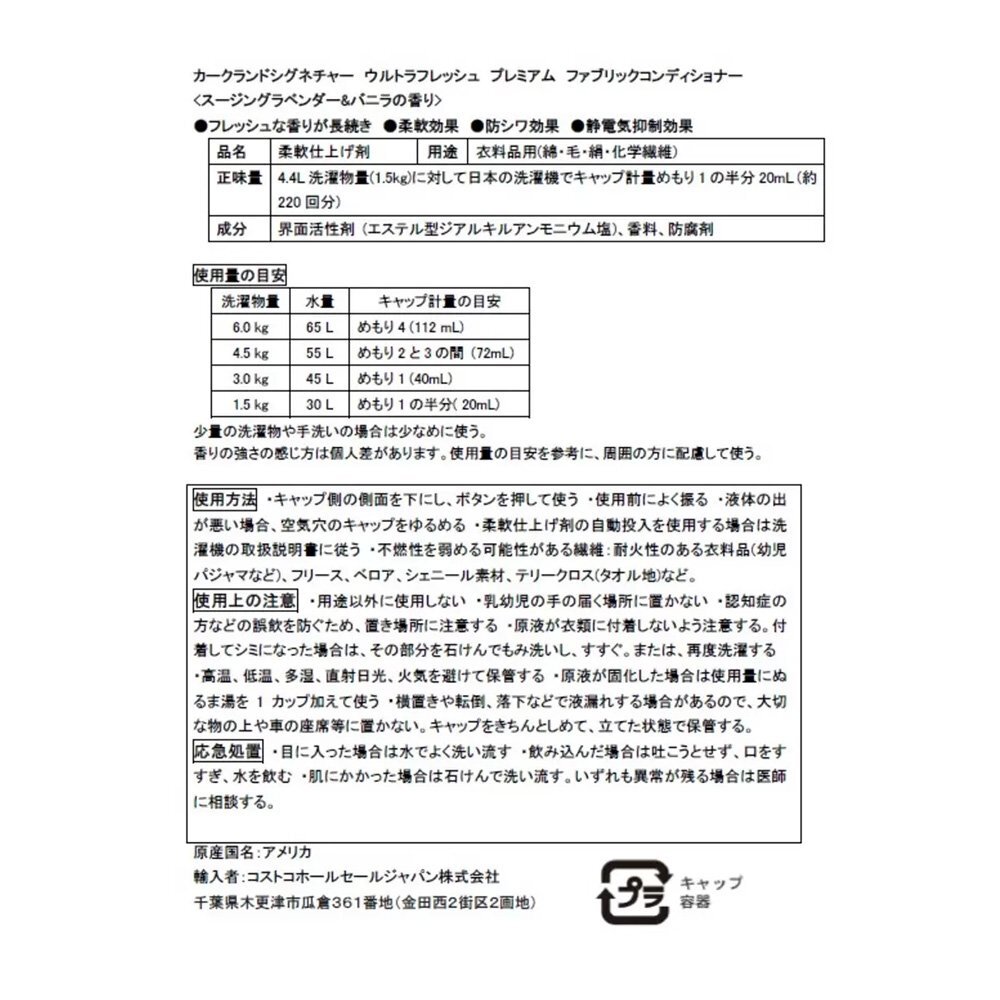 カークランドシグネチャー ラベンダー濃縮柔軟剤は消臭テクノロジーにより嫌なニオイから守ります。 静電気を防ぎ、どのタイプの洗濯機にも対応しています。 爽やかな香りを保ち、洗うたび香りがはじけます。 |