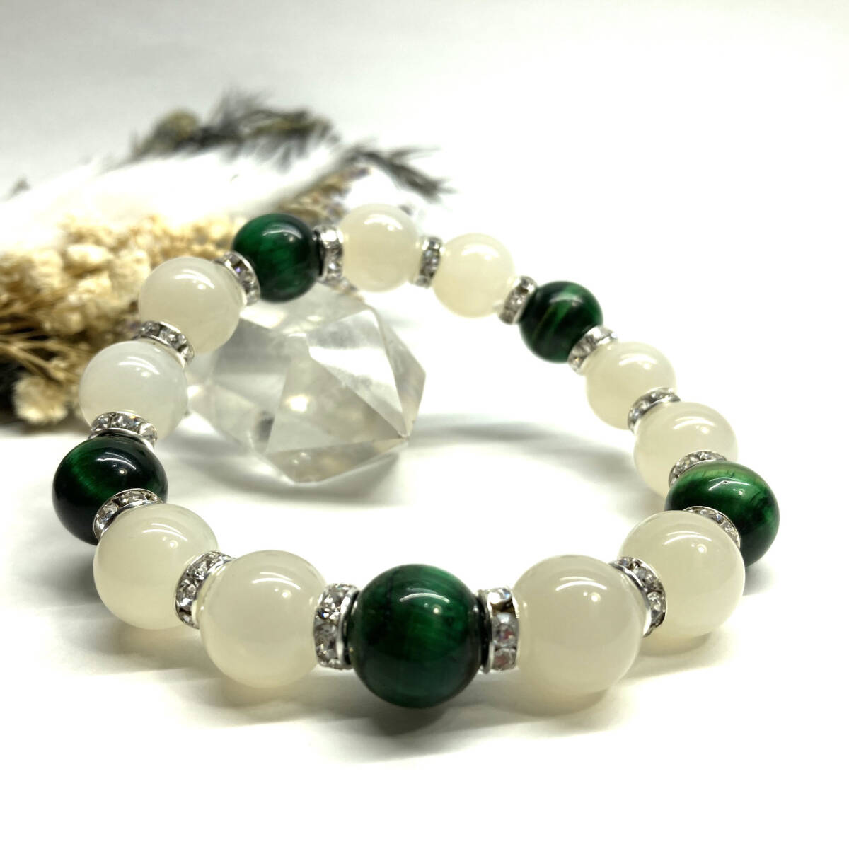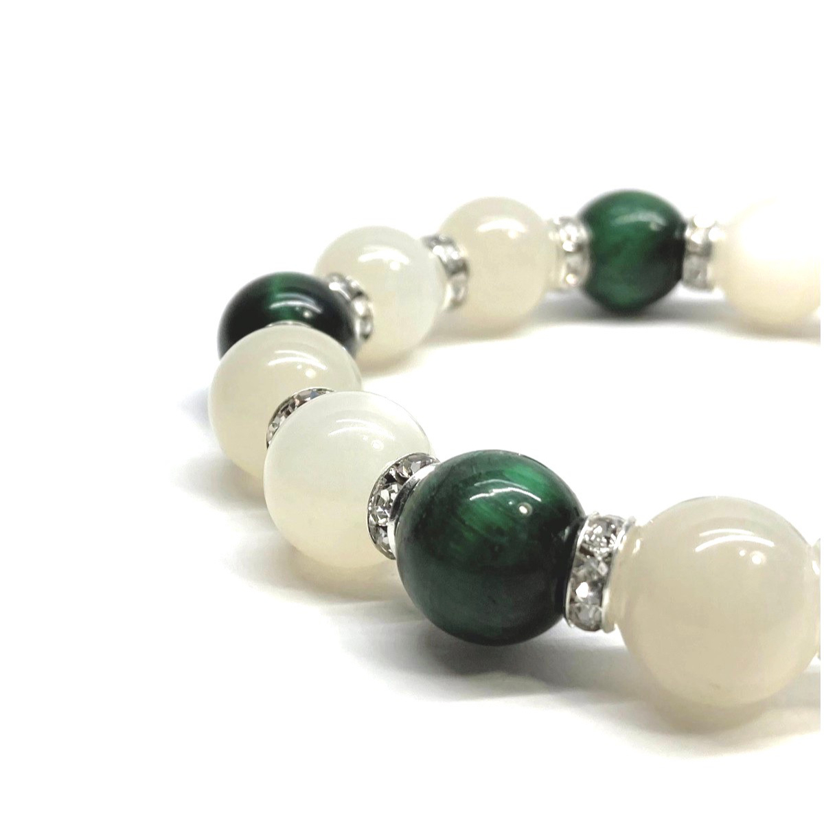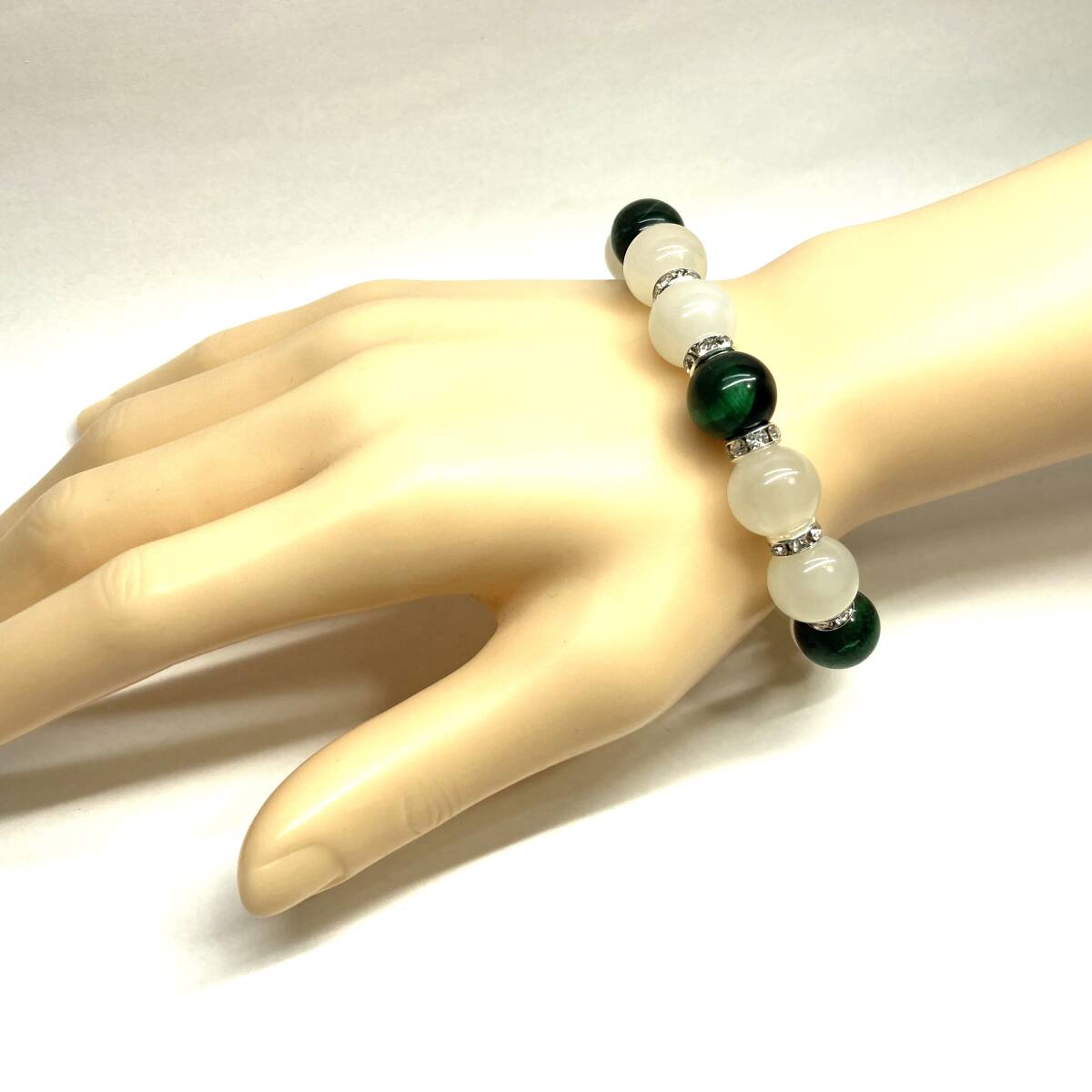 こちらは、ムーンストーンとグリーンタイガーアイを組み合わせたパワーストーンブレスレットです。間にはロンデルを挟み高級感あるデザインに仕上げております。程よくインパクトがある12mm玉を使用して内周約18cmです。(サイズ変更の場合は取引ナビにてご連絡をお願いします。) 数に限りがございますので気になる方はお早めにどうぞ。