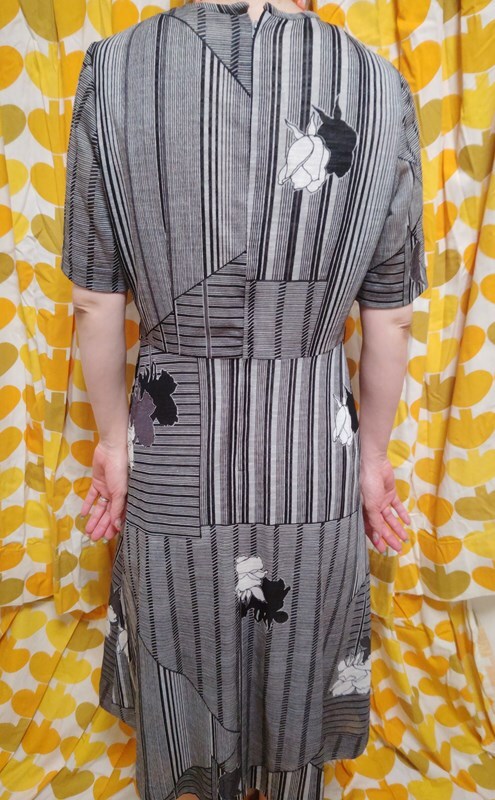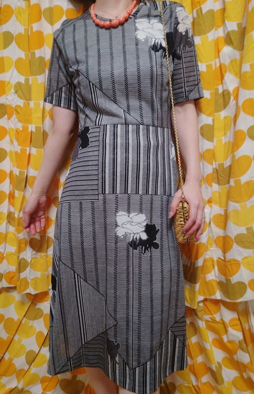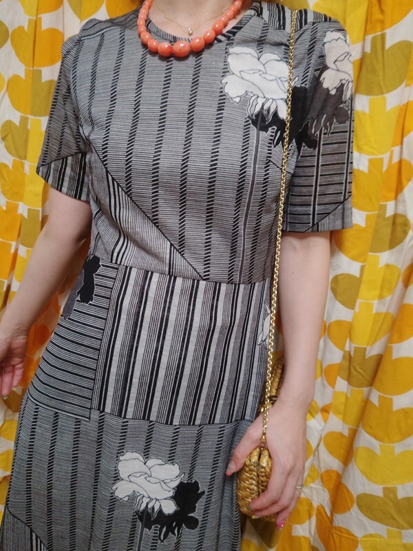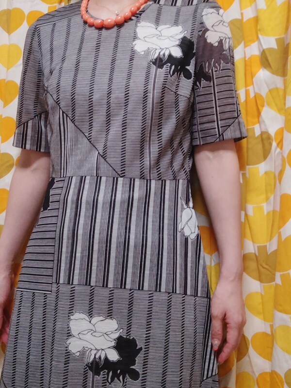 ヴィンテージ昭和レトロ古着*黒グレー白お花x幾何学柄ワンピ60’s70’sモダン国産