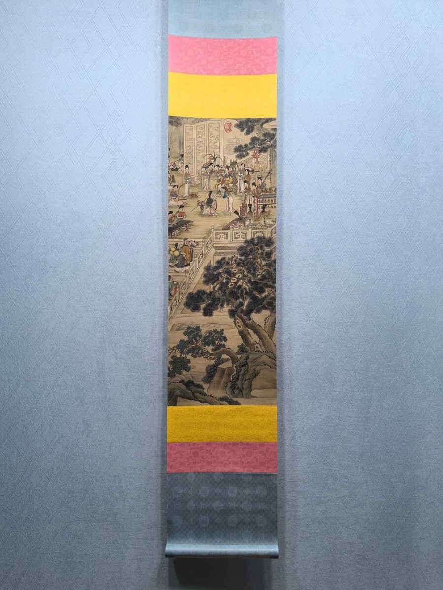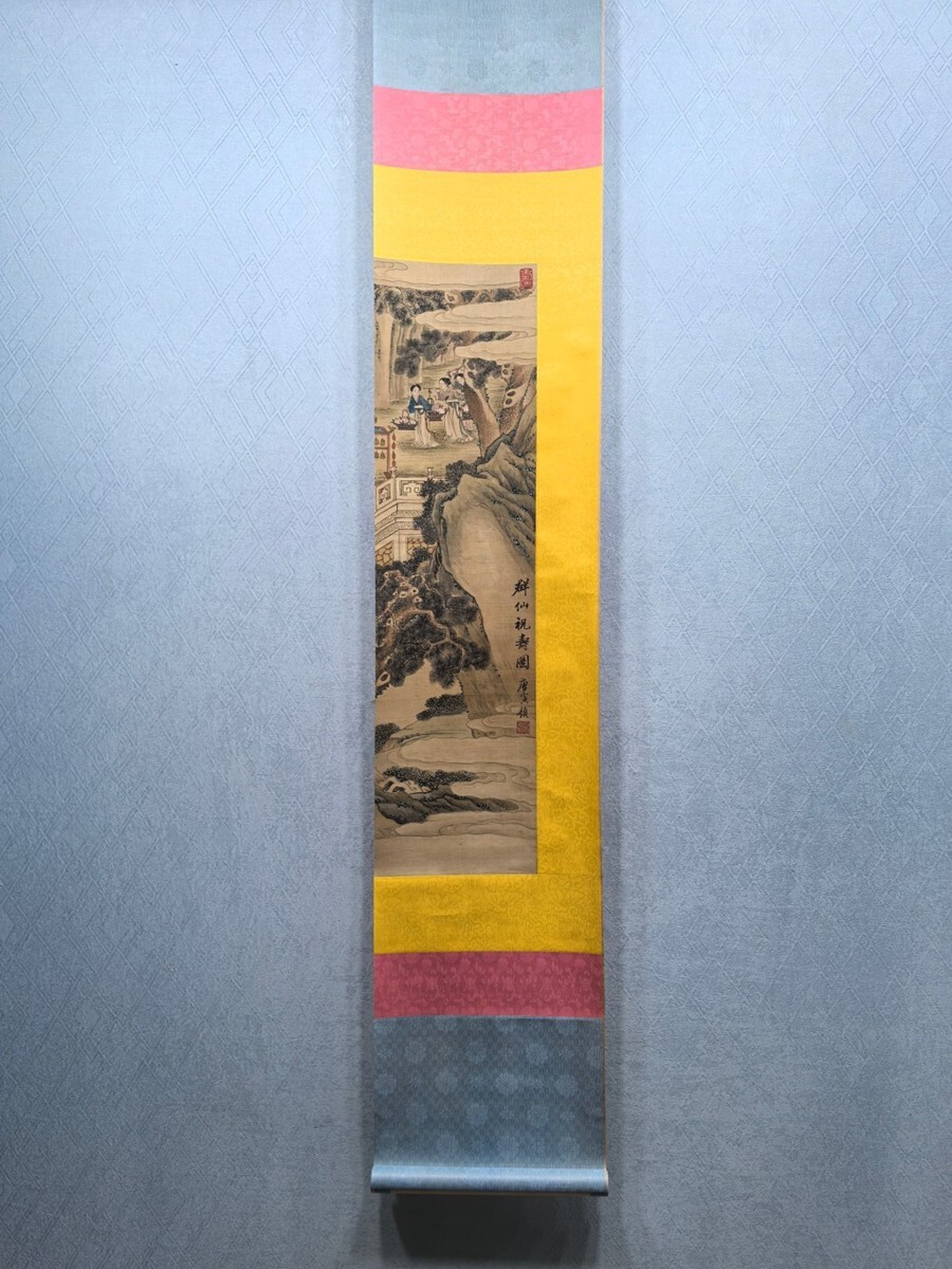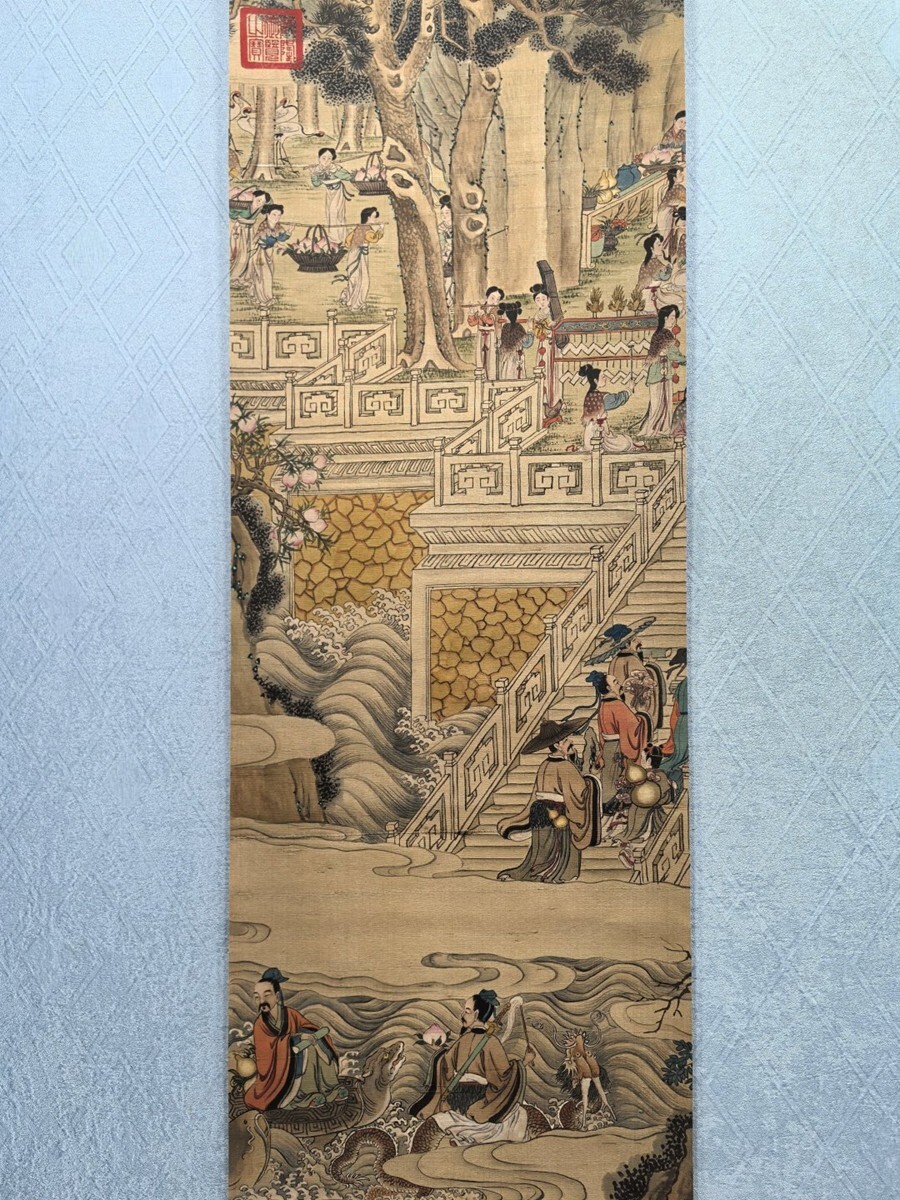 「仇英畫 群仙祝壽図通景 八條屏」明代画家 肉筆絹本【仁】掛け軸 書画立軸 巻き物 中国書画 古美術 蔵出 畫芯約34.2×90.6cm
