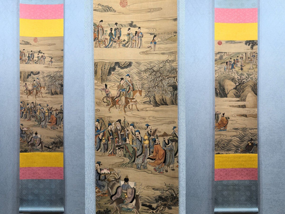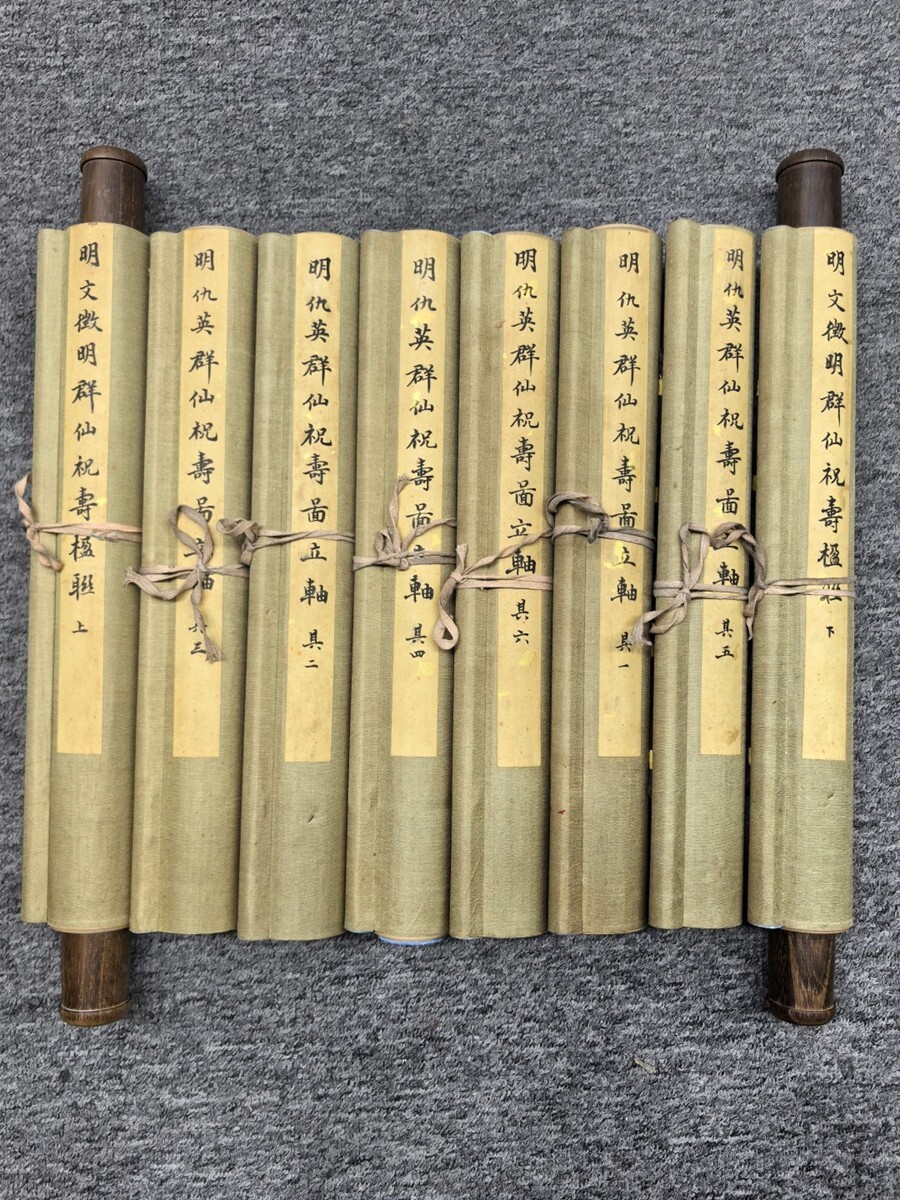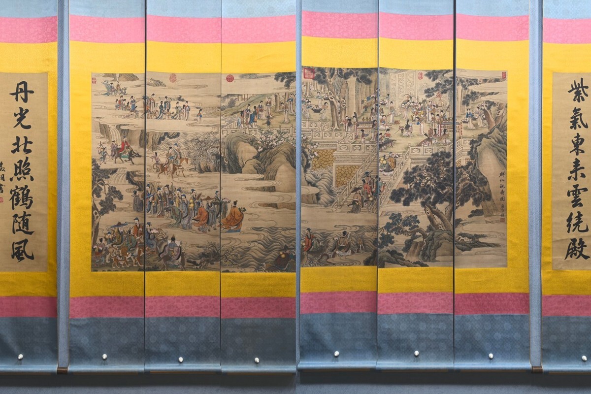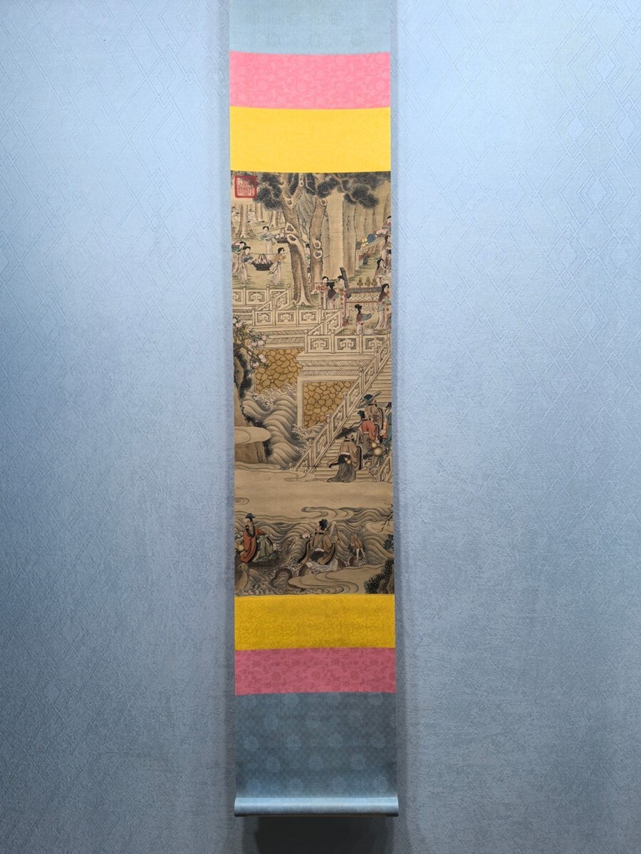 「仇英畫 群仙祝壽図通景 八條屏」明代画家 肉筆絹本【仁】掛け軸 書画立軸 巻き物 中国書画 古美術 蔵出 畫芯約34.2×90.6cm