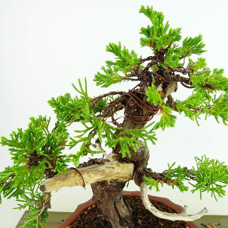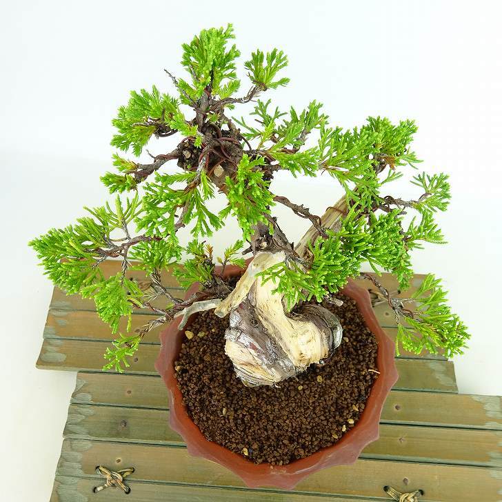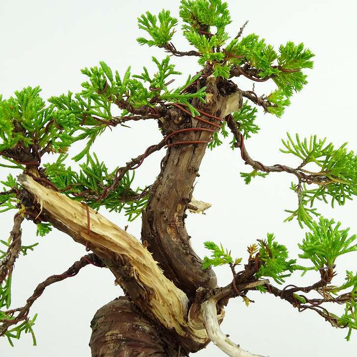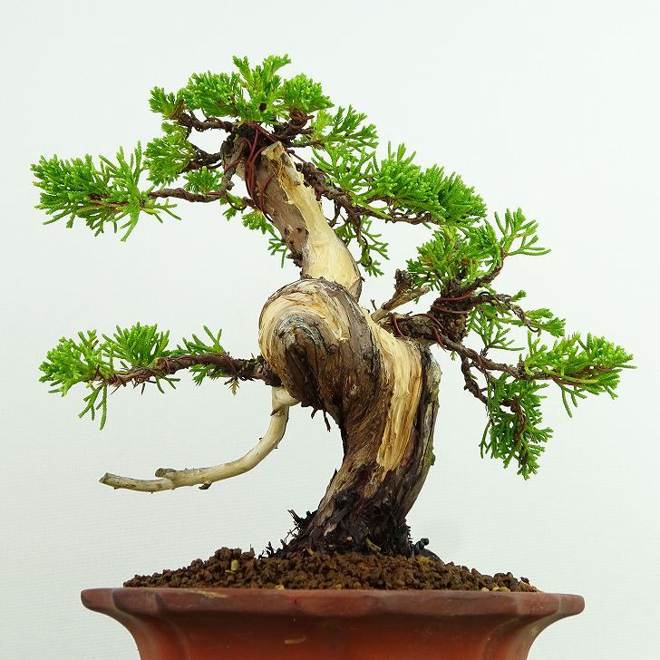 | ■植物ですので撮影時期や季節によって剪定などの手入れにより写真から変化がございます。撮影日をご確認のうえ、ご注文ください。 ■年に一度、冬頃にジン・シャリのお手入れをおこなっています。薬品の関係で黄色く変色しているようにみえる場合がありますが徐々に薄れていくので問題はありません。 【真柏盆栽】 シンパクの1番の特徴と言えば、短く締った紐状の葉と、わずかな水吸いでも生き抜くことができる強靱な幹枝です。自然界では積雪や強風などで押しつぶされ木部が露出し、朽ちて白骨化したものが見られます。枝の一部が白骨化したものを神(ジン)、幹の場合は舎利(シャリ)といいます。 |