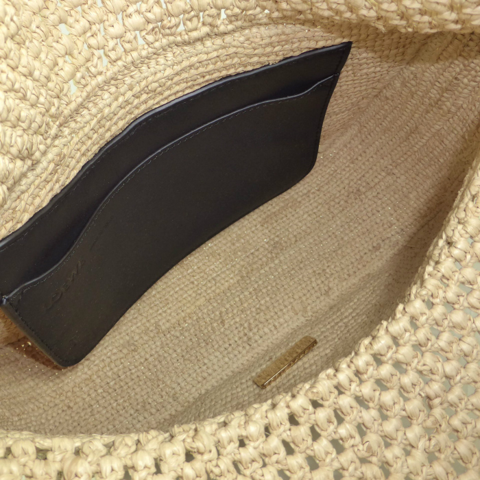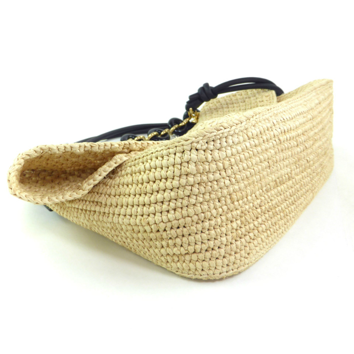 | こちらのお品は新品になりますが、入荷時よりロゴに歪みが見受けられます。また品番タグが欠品しております事ご了承くださいませ。※天然素材の手作りの為、若干のゆがみやラフィア素材の飛び出し等はご了承ください。 |