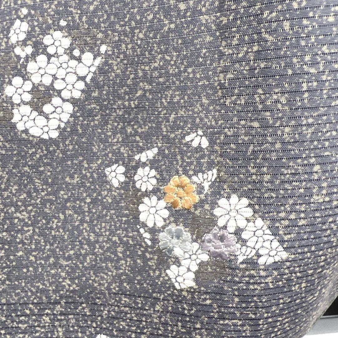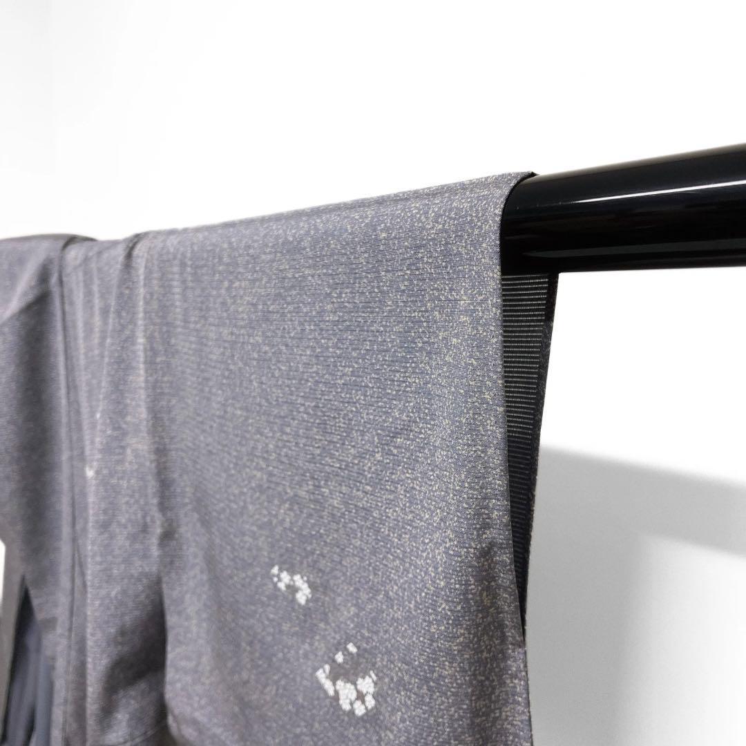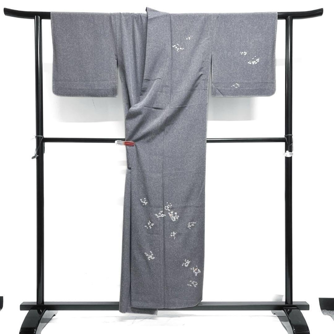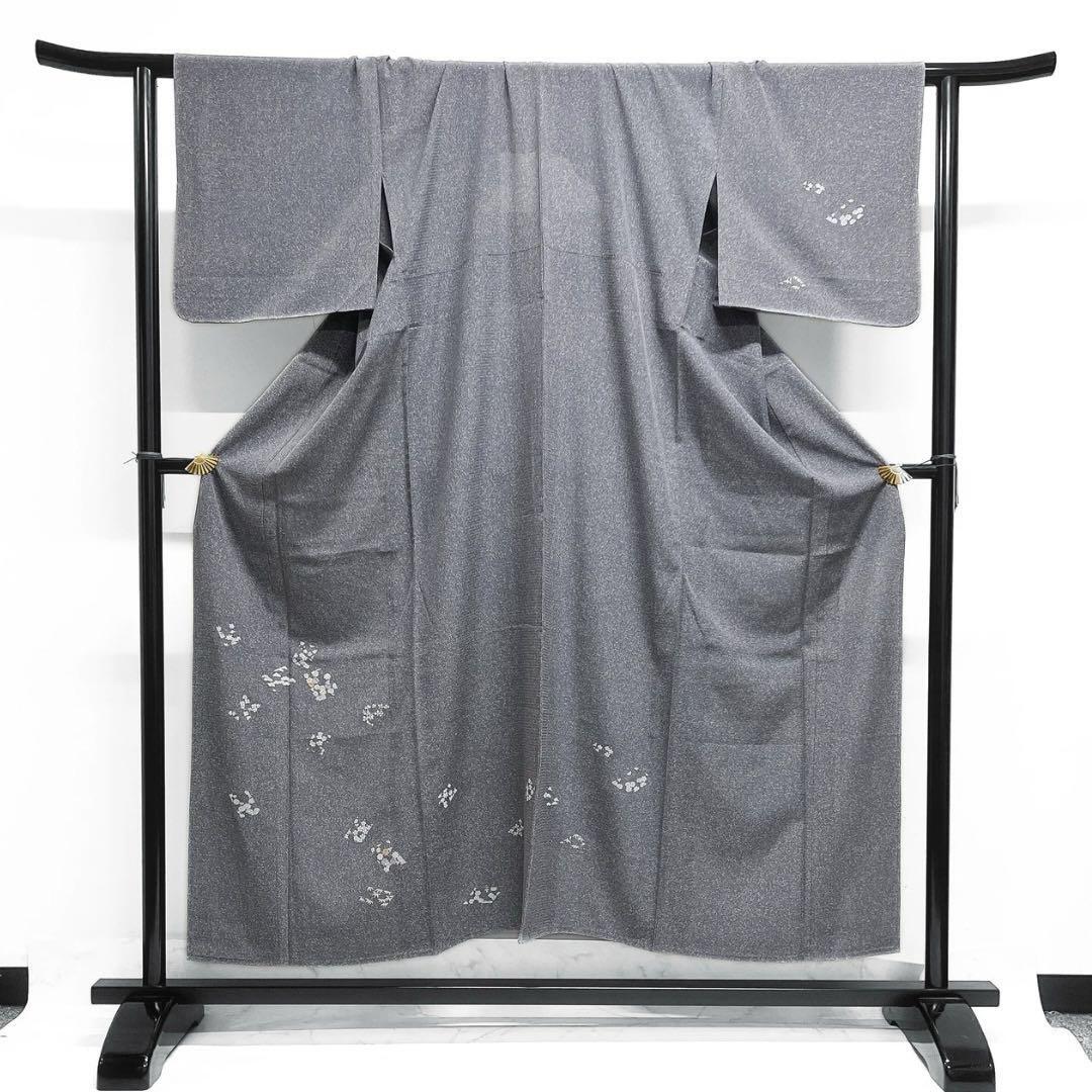 深いグレーのたたき染の絽の地に色紙に刺繍とくすみの銀彩を交えて描かれた花模様や松の文様が華やかなデザインの一着です。