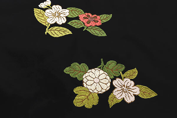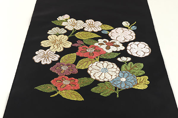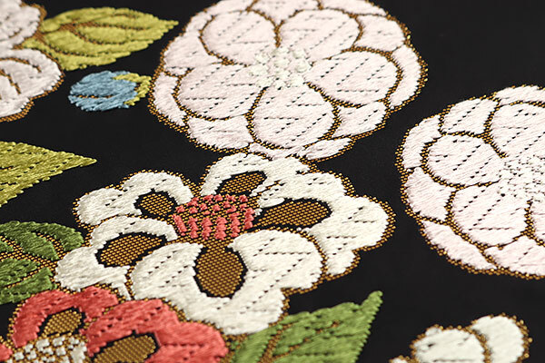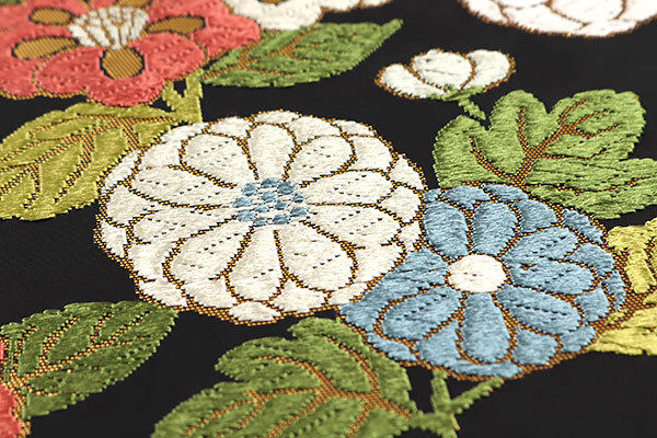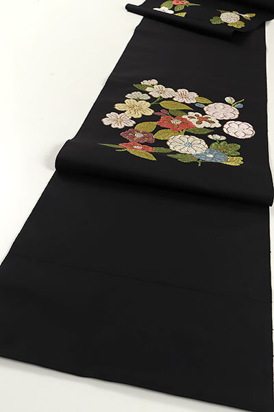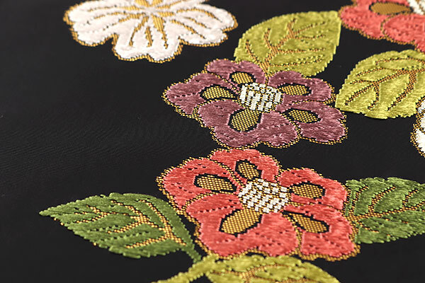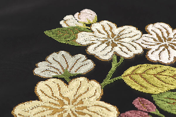 「花卉文様」と題された軽やかな帯地は、シックな黒色のお色目でございます。