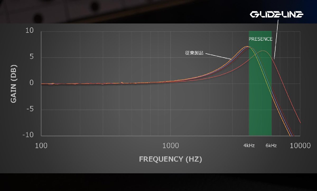 従来の3製品は4kHz付近の周波数帯からピークが下がっていますが、一方でGLIDELINEは5kHzを超える帯域までピークがあります。