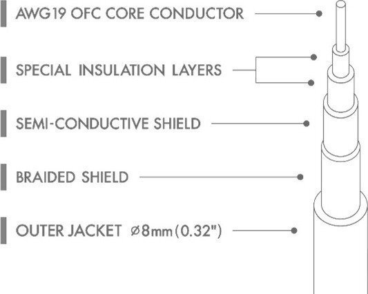 半導電性シールドの周りに編組形状のOFC(OxygenFree Copper/無酸素銅シールドを巻くことで、高いノイズ耐性を発揮します。