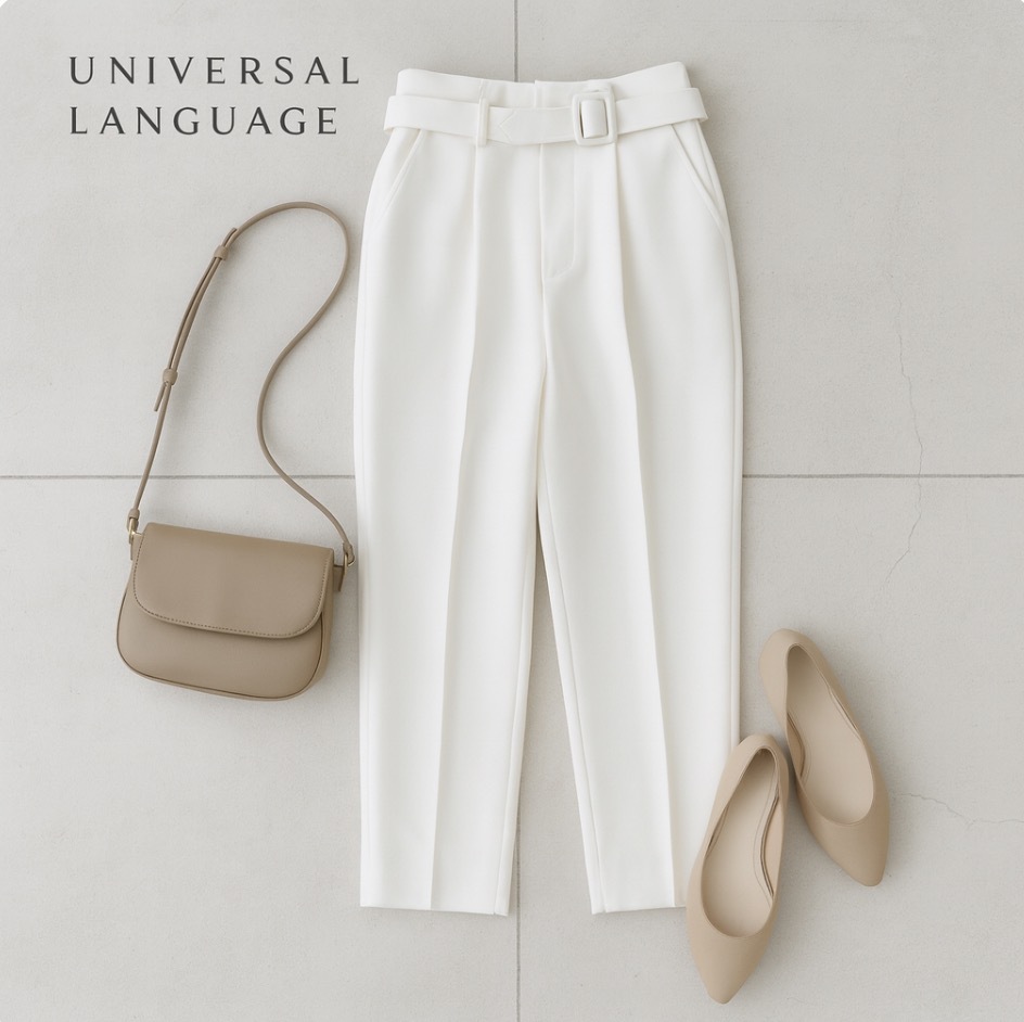 ハイウエスト仕様に加え、ベルト付きで腰回りを美しく整え、センタープレスが脚のラインをきれいに見せます。