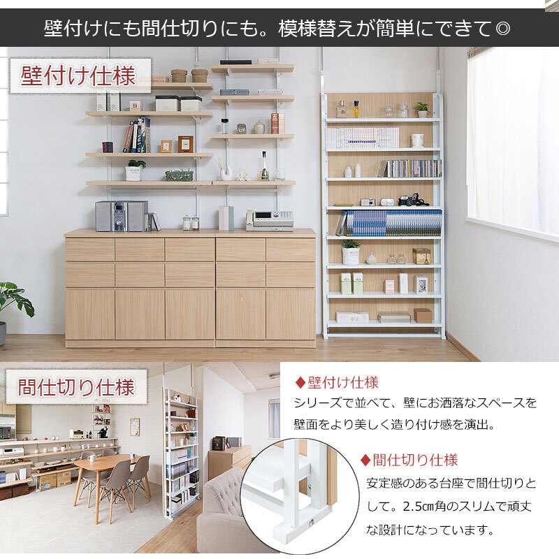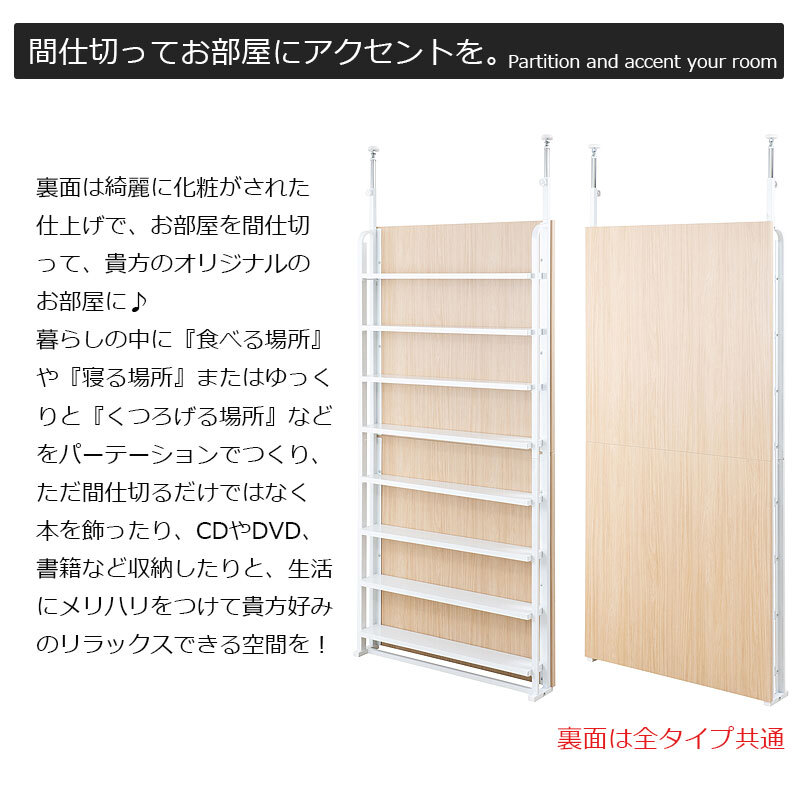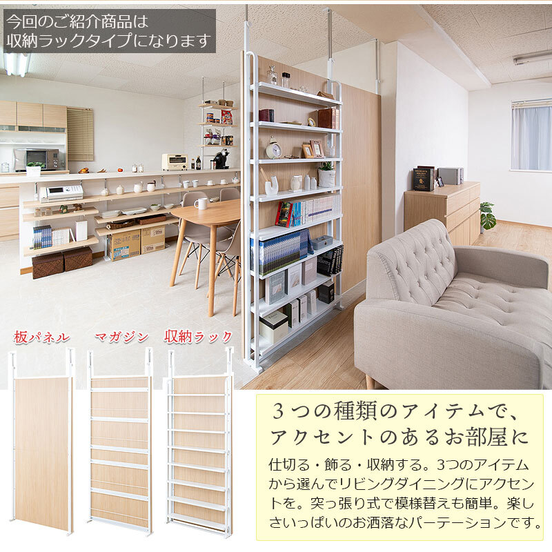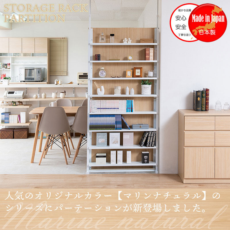 ■商品について/大人気のオリジナルカラー【マリンナチュラル】シリーズにパーテーションが新登場しました。3種類のアイテムで仕切る・飾る・収納するのアクセントのあるお部屋に。突っ張り式で模様替えも簡単♪楽しさいっぱいのお洒落なパーテーションです。プレート棚が8段あり、コミック本収納やディスプレイラックとして整理整頓しながらインテリア性高いシーンに。リビングやキッチン等、さまざまな空間で活躍し、あなたのお部屋をお洒落に演出します。ワンルームの空間など寝室とクローゼットを仕切って落ち着いた癒し突っ張り式で場所替えも簡単なのでひとつあると重宝します。
