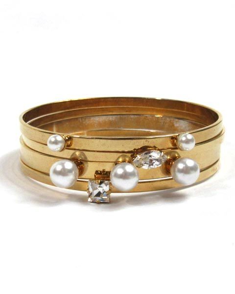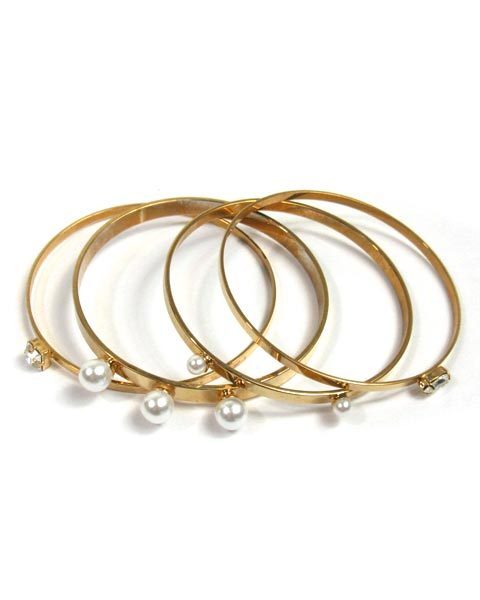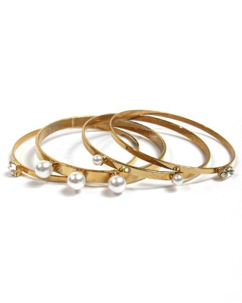 | 組み合わせ自在♪エレガントな4連バングル☆ゴールドにパール×クリアストーンでエレガントなお手元に。華やかに重ねづけ、シンプルに1本だけと、コーディネートや他のアクセと合わせたアレンジもお楽しみ頂けます。 |