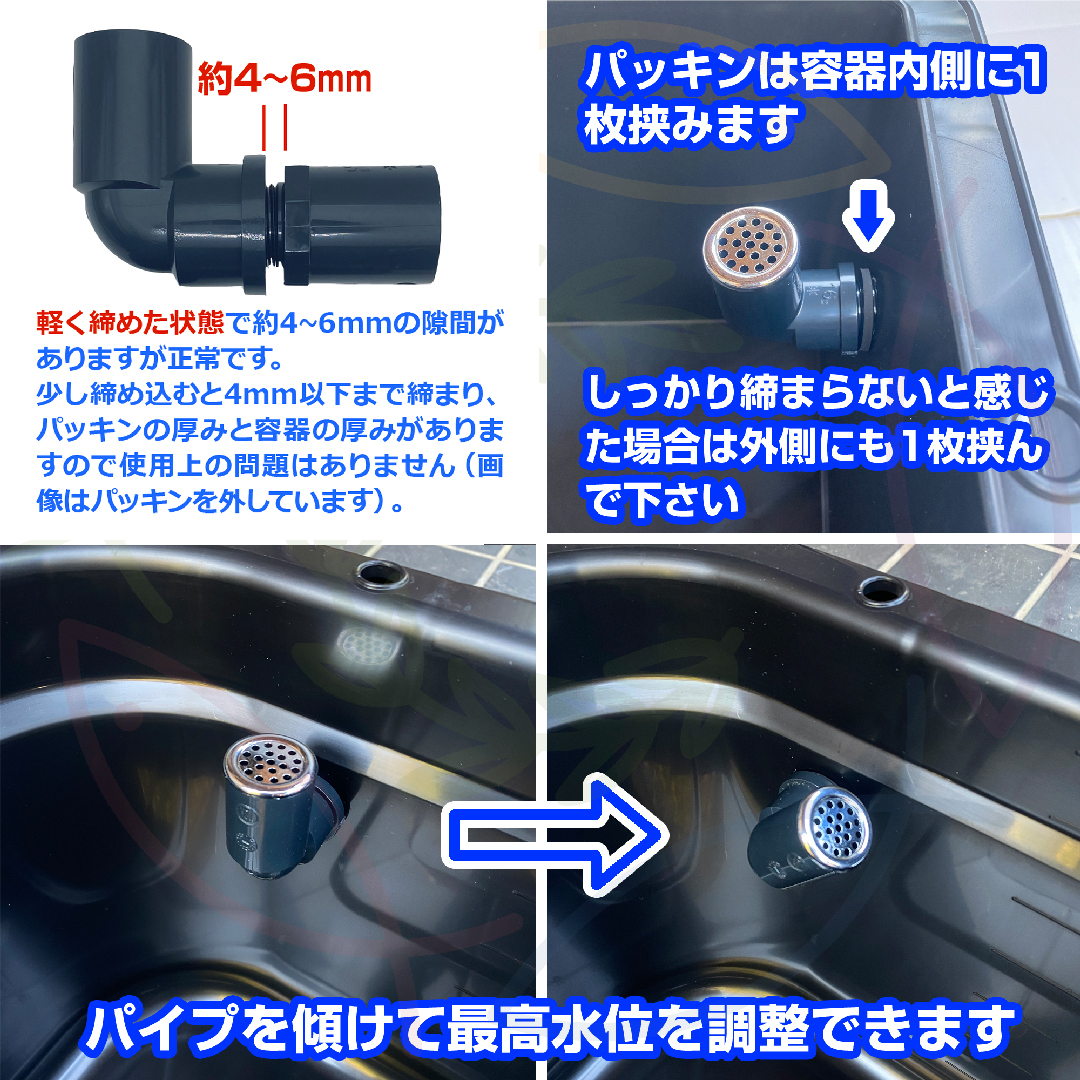 特にご指定が無い場合、短辺側の向かって右寄り、容器上端から約30mmで排水される位置に取り付けます(掲載写真の位置)