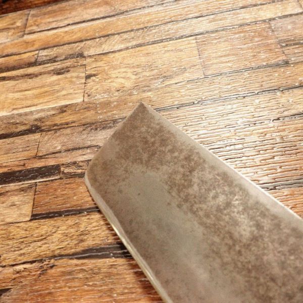 菜切り包丁は両刃の野菜用包丁で、直線的な刃が特徴で野菜の切断に適しています。このお品は両刃のハガネ製で、鋭い切れ味が楽しめます。銘が薄くなっており、土佐特製は読み取れますが、その間に菱形のロゴが見られます。その中の文字が読み取れません。丁寧お手入れされて使われてきたお品でしょう。