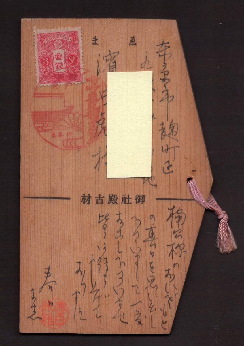 実逓便〈絵馬/御社殿古材〉田沢切手3銭/単片貼/風景印/神戸中央.8.5.17