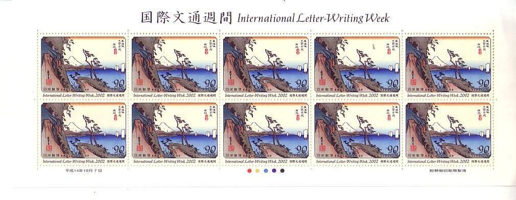「国際文通週間2002 東海道五拾三次之内 由井」の記念切手です(90円切手X10枚)。送料は普通140円(普通便 複数同梱発送では180円)になります。