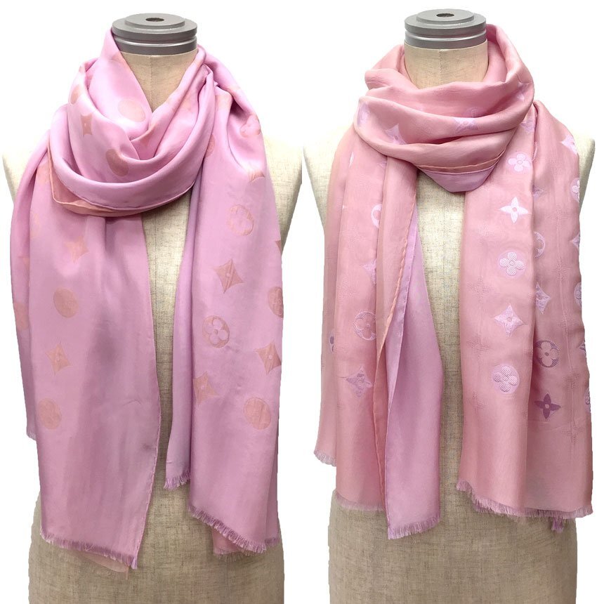 | PRコメント | ルイヴィトンよりリバーシブルで使えるロングストールが入荷! 2枚の生地を合わせてあるので、どちらのカラーを裏表にしてもお使いいただけます! 軽やかで、サラサラ&柔らかい肌さわりですので、冷房対策や日焼け防止にも最適です♪ LVマークが織り出された2種類のピンクシフォンのコントラストが上品な一枚です。 MADE IN ITALY  |