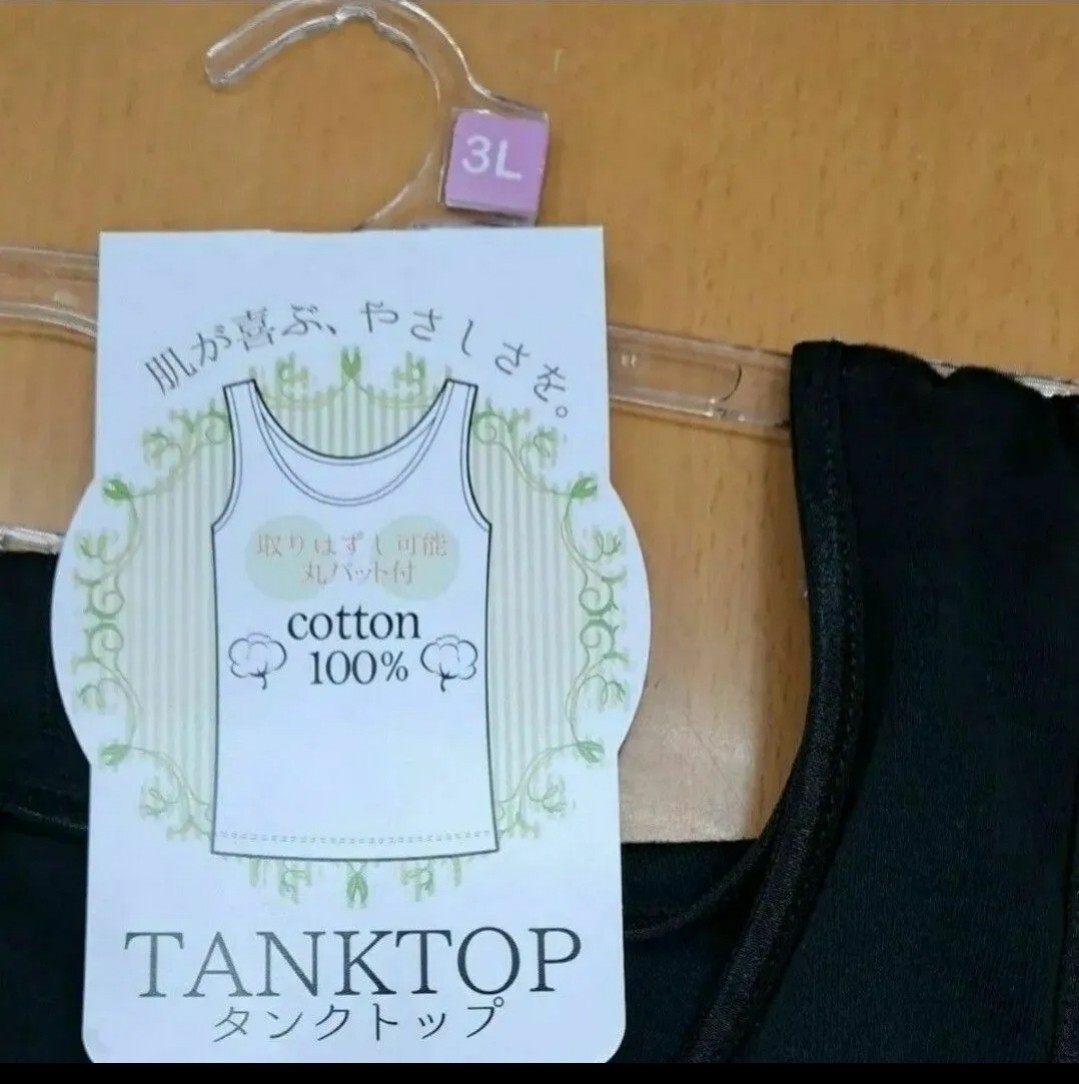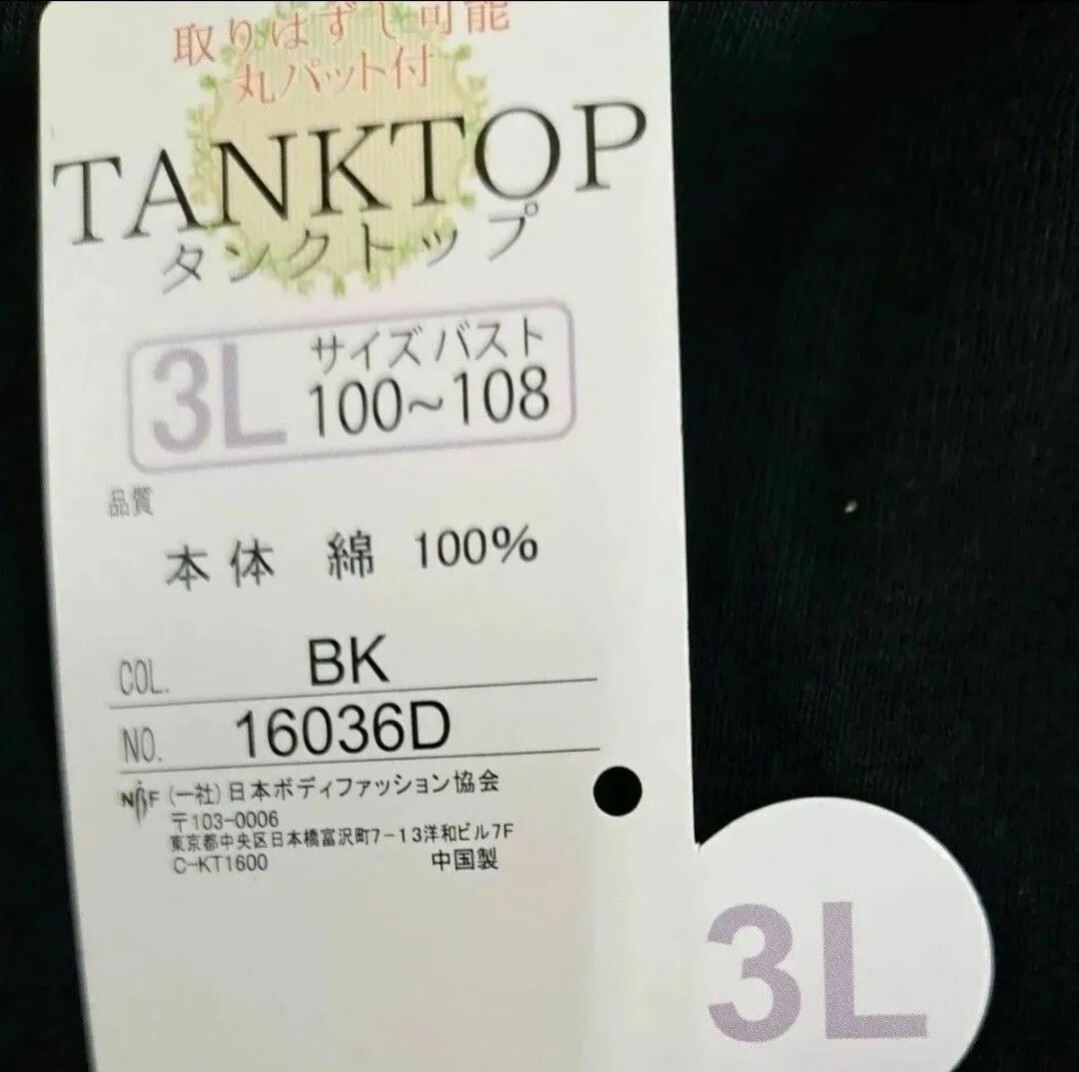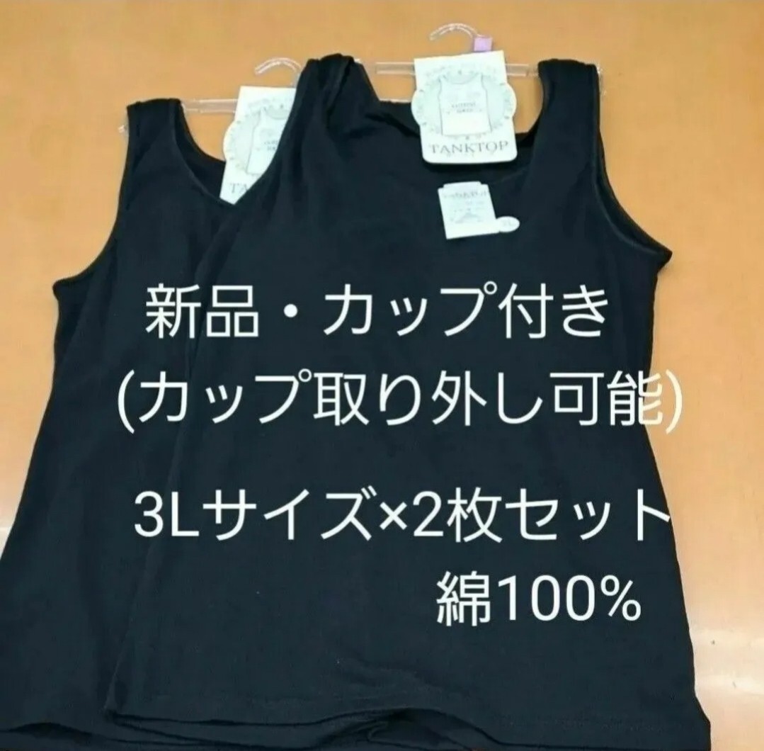新品・綿100%☆3Lレディースカップ付きタンクトップ黒2枚(カップ取り外し可)