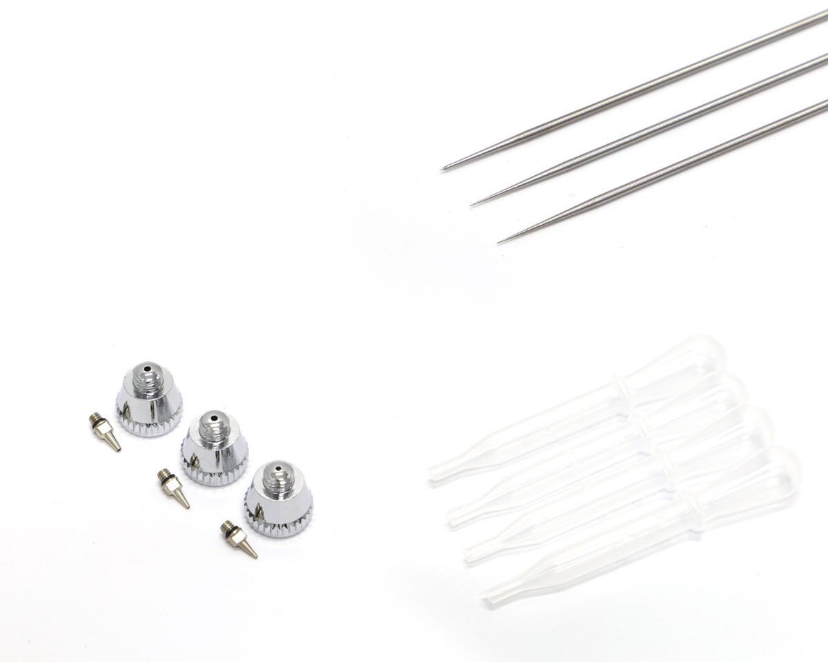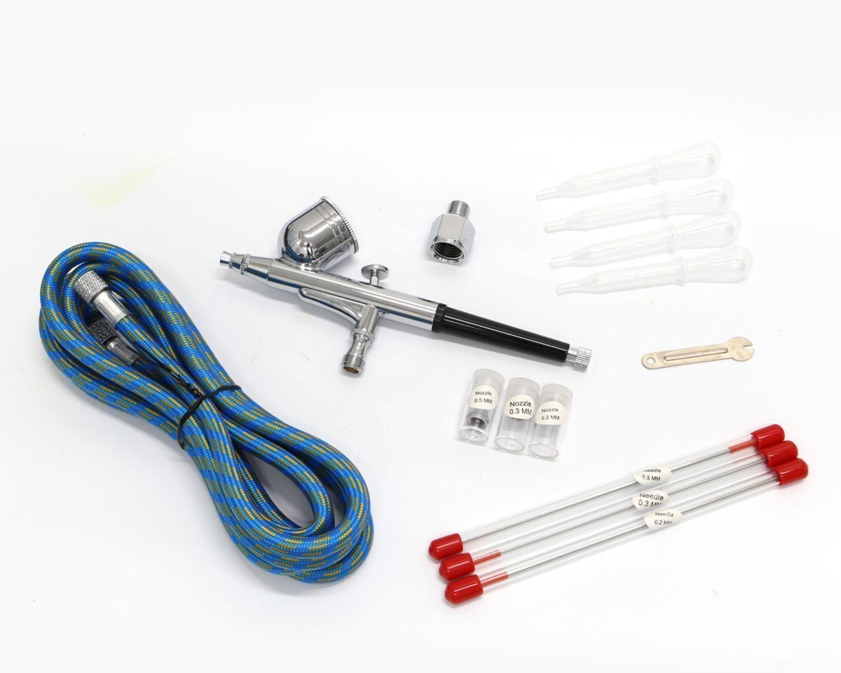 | ダブルアクション重力式エアブラシキット仕様 | タイプ:ダブルアクション ノズル口径:0.3mm カップ容量:7cc 使用空気圧:1kg/cm?~3.5kg/cm? エアー入力:1/8"BSP サイズ:ハンドピース本体:約150mmx85mmx25mm 付属品 スポイト×4 スパナ アダプタ ホース(2m) 付属品(ニードル口径) 0.2mm×1 0.3mm×1 0.5mm×1 付属品(ノズル口径) 0.2mm 0.3mm 0.5mm |