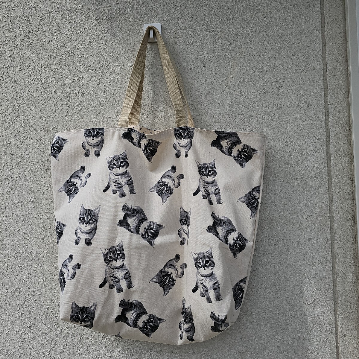 サイズは、高さ40cm、横 上部54cm、底部38cm、マチ15cm、ヒモ50cmです。
