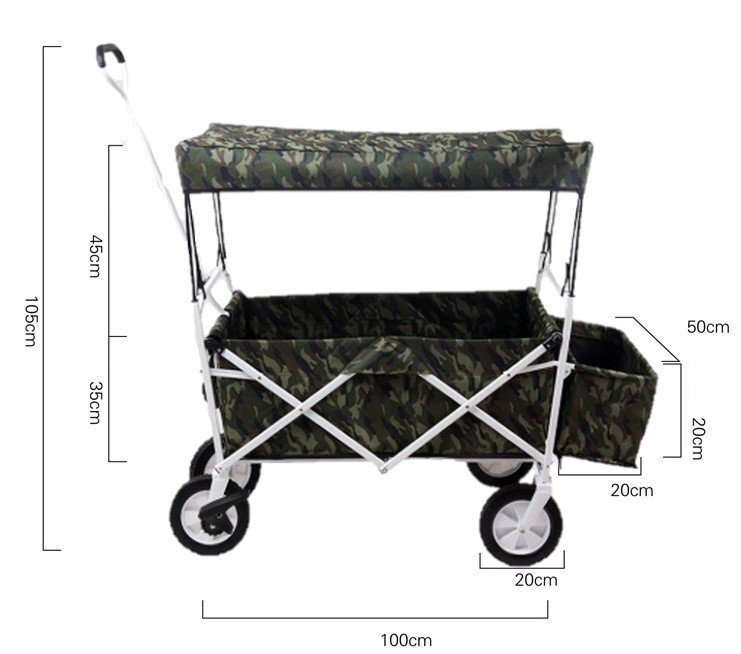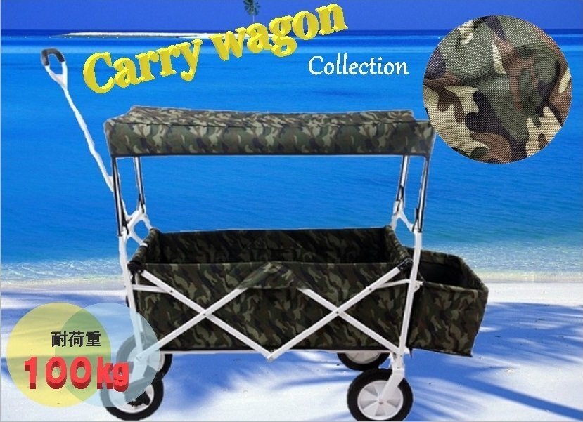 ワンランク上のSelection【カモフラ迷彩緑×白骨組み】キャリーカート フルキッド 折り畳み式 屋根/ストッパー/サブワゴン/収納袋付き