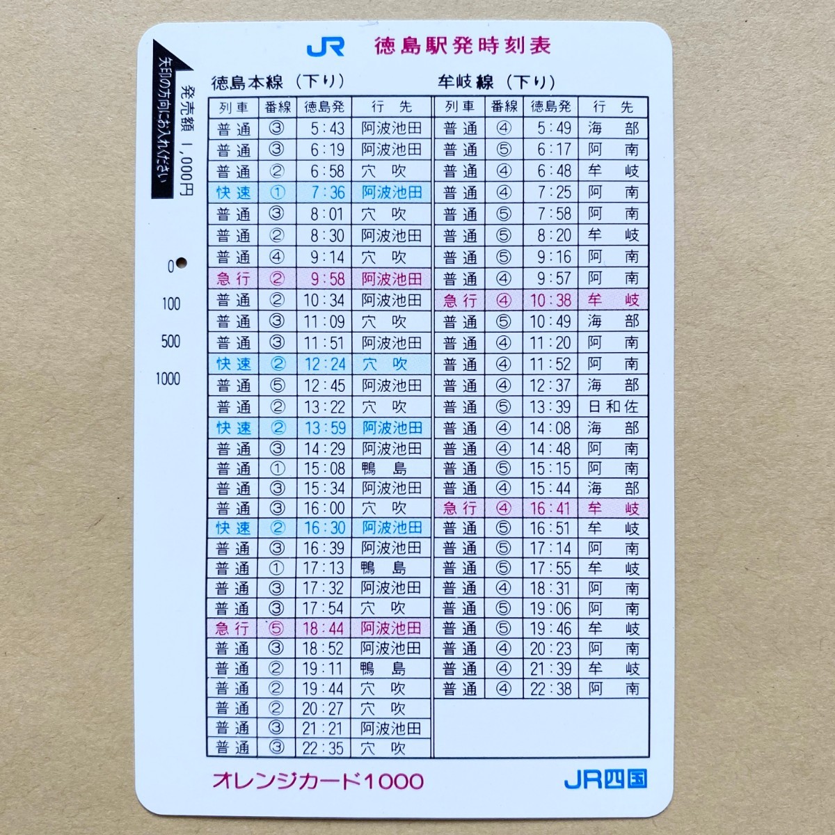 【使用済】 オレンジカード JR四国 徳島駅発 時刻表 徳島本線 牟岐線