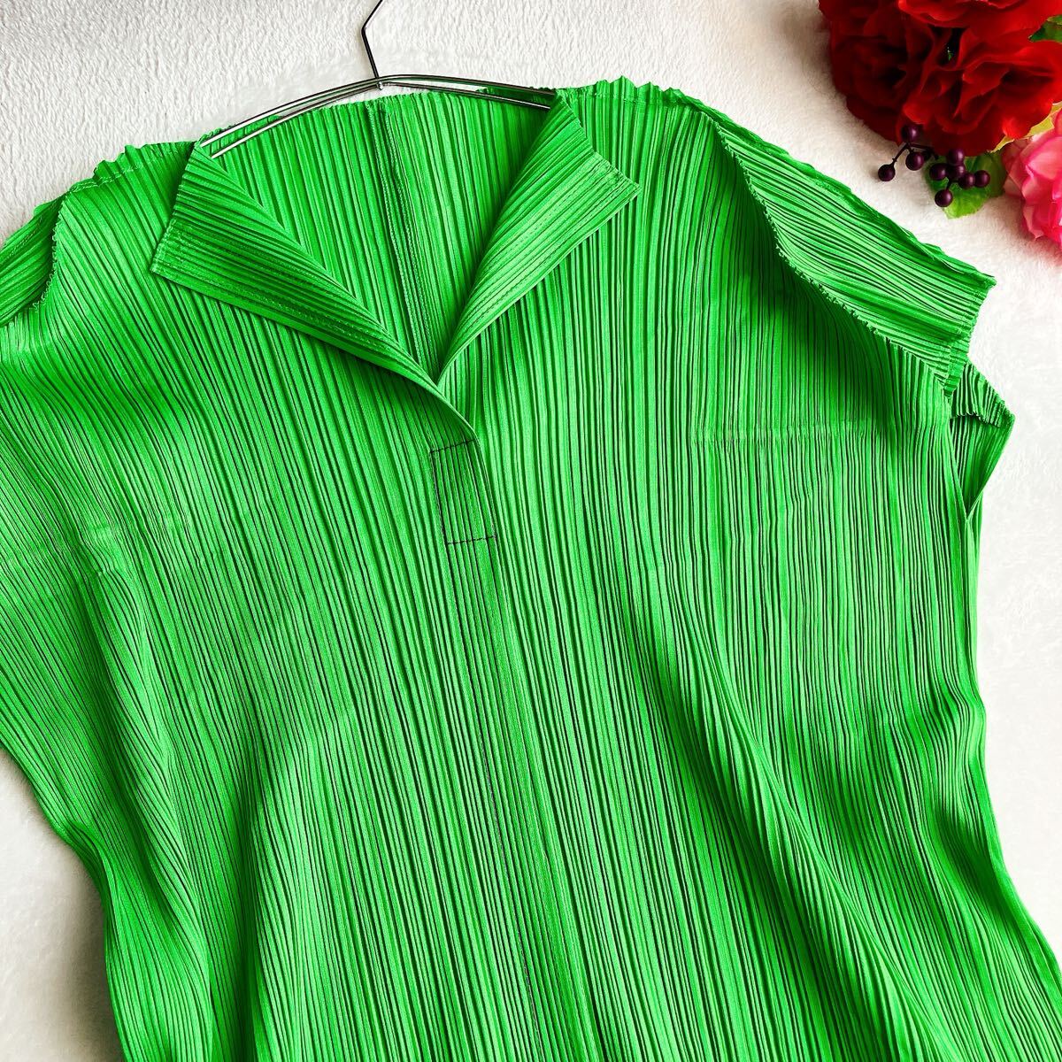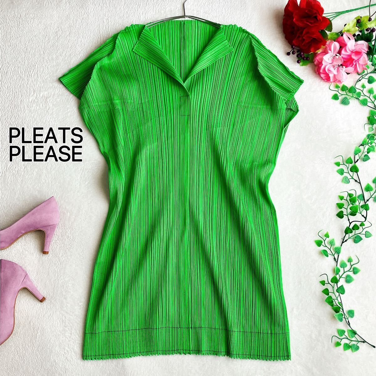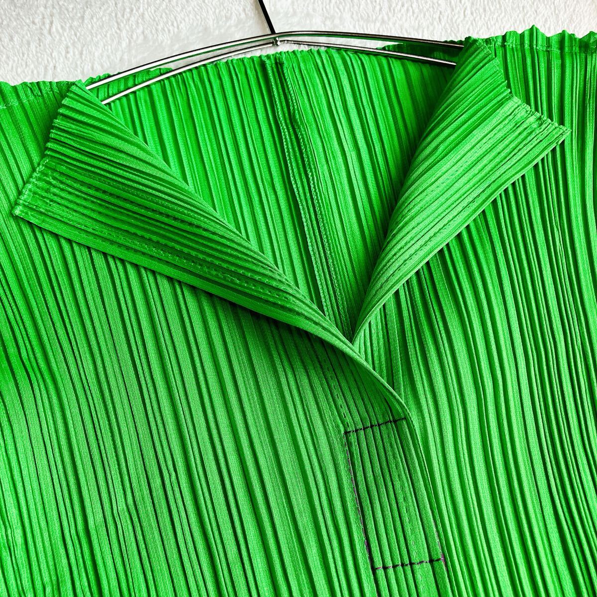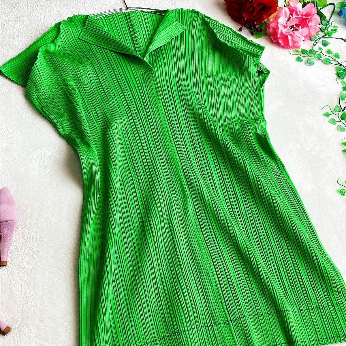 PLEATS PLEASE ISSEY MIYAKE プリーツプリーズ イッセイミヤケ★ビッグシルエット イタリアンカラー ワンピース ステッチ ライトグリーン