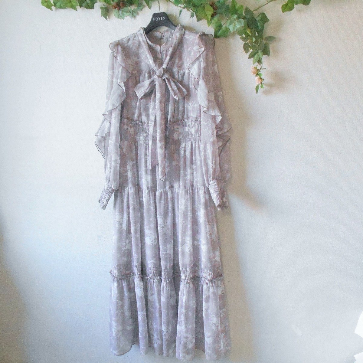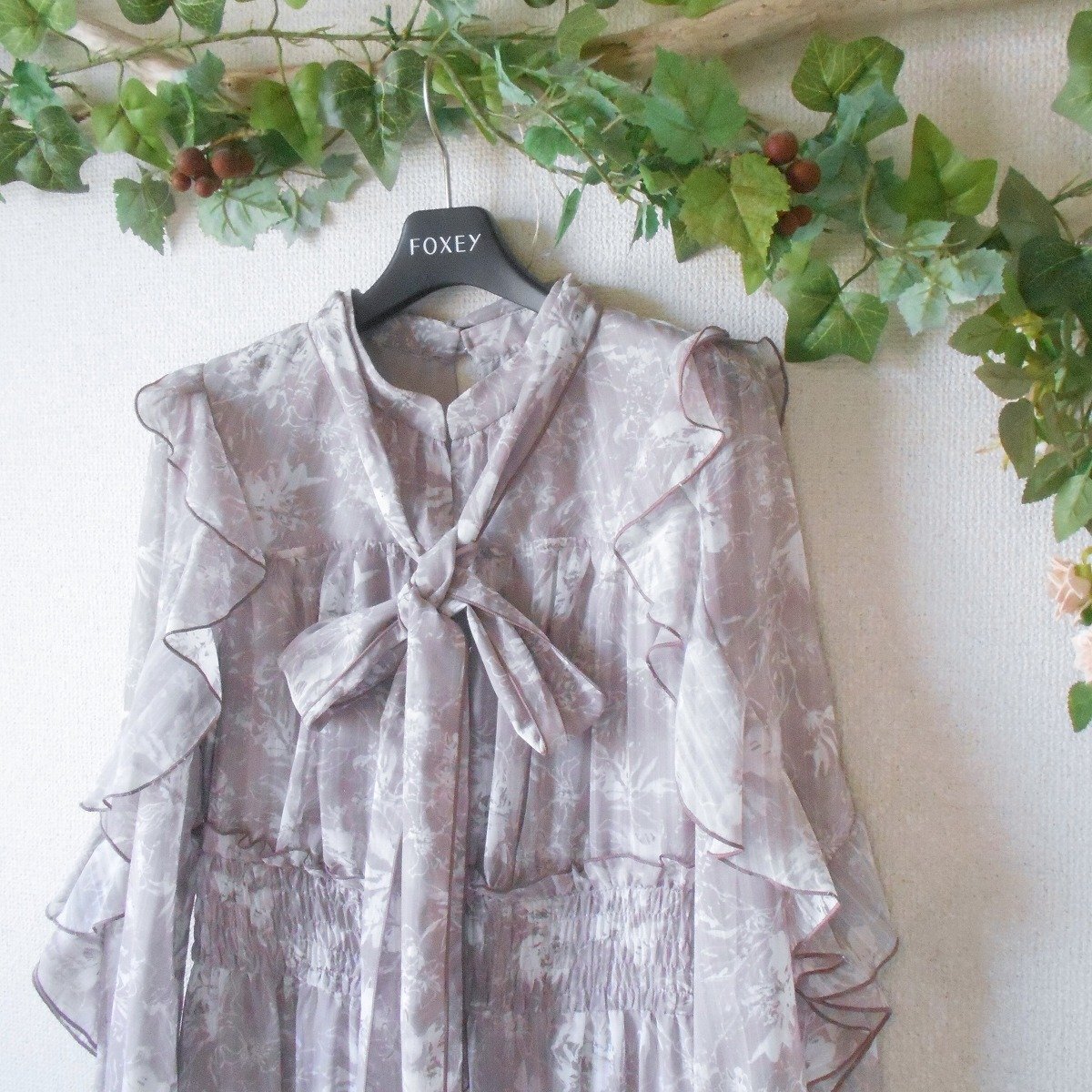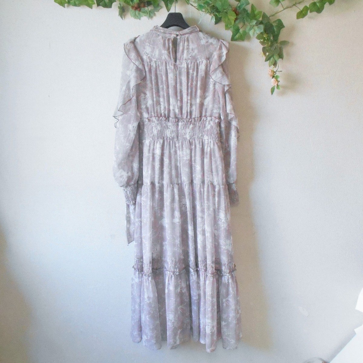 【ポイント】アプワイザーリッシェのワンピースになります。お色は少しパープル混ざりのベージュ系で春夏を中心に着ていただけるお品です。ネックにはリボン、お袖にはフリルが使用された、とっても素敵なデザインです。