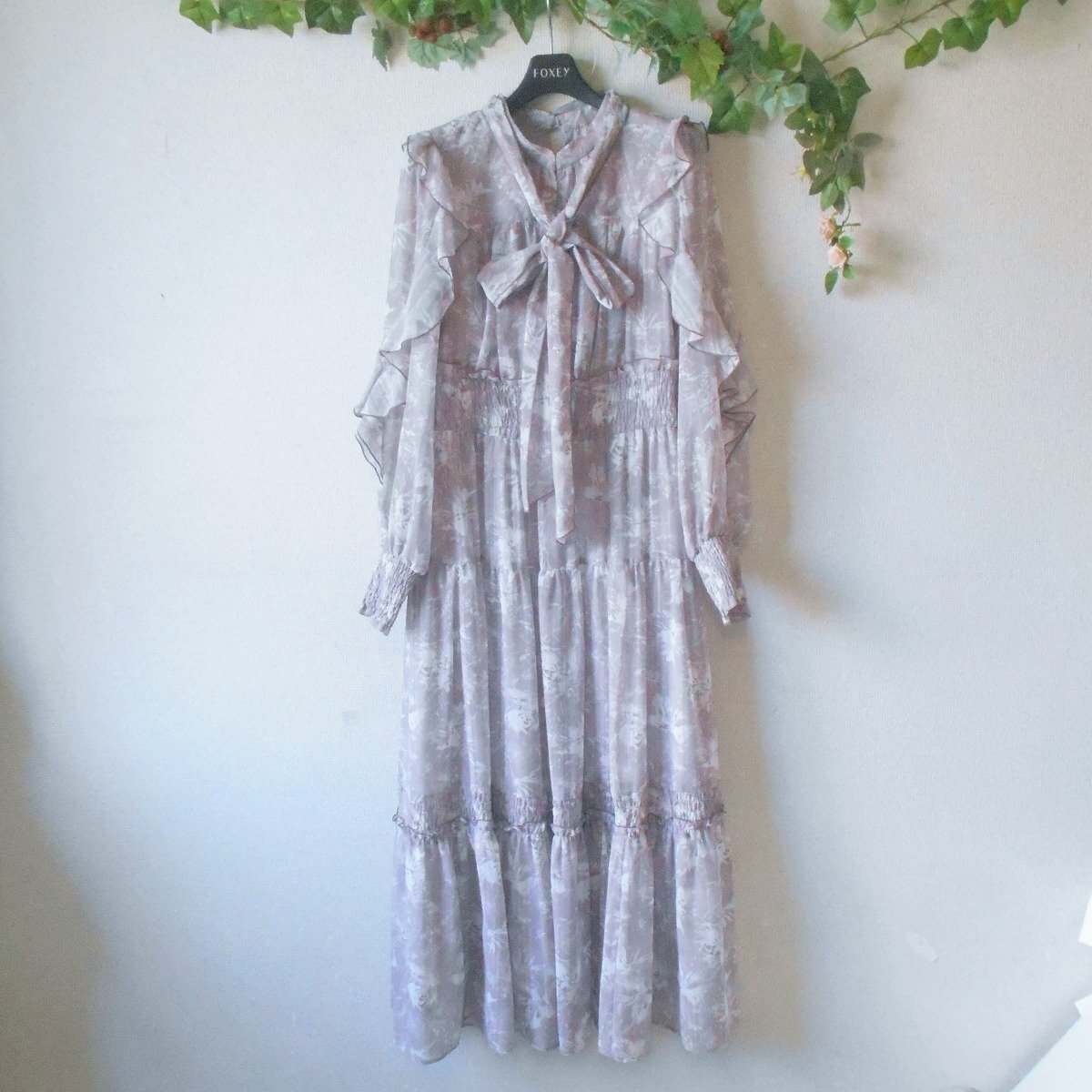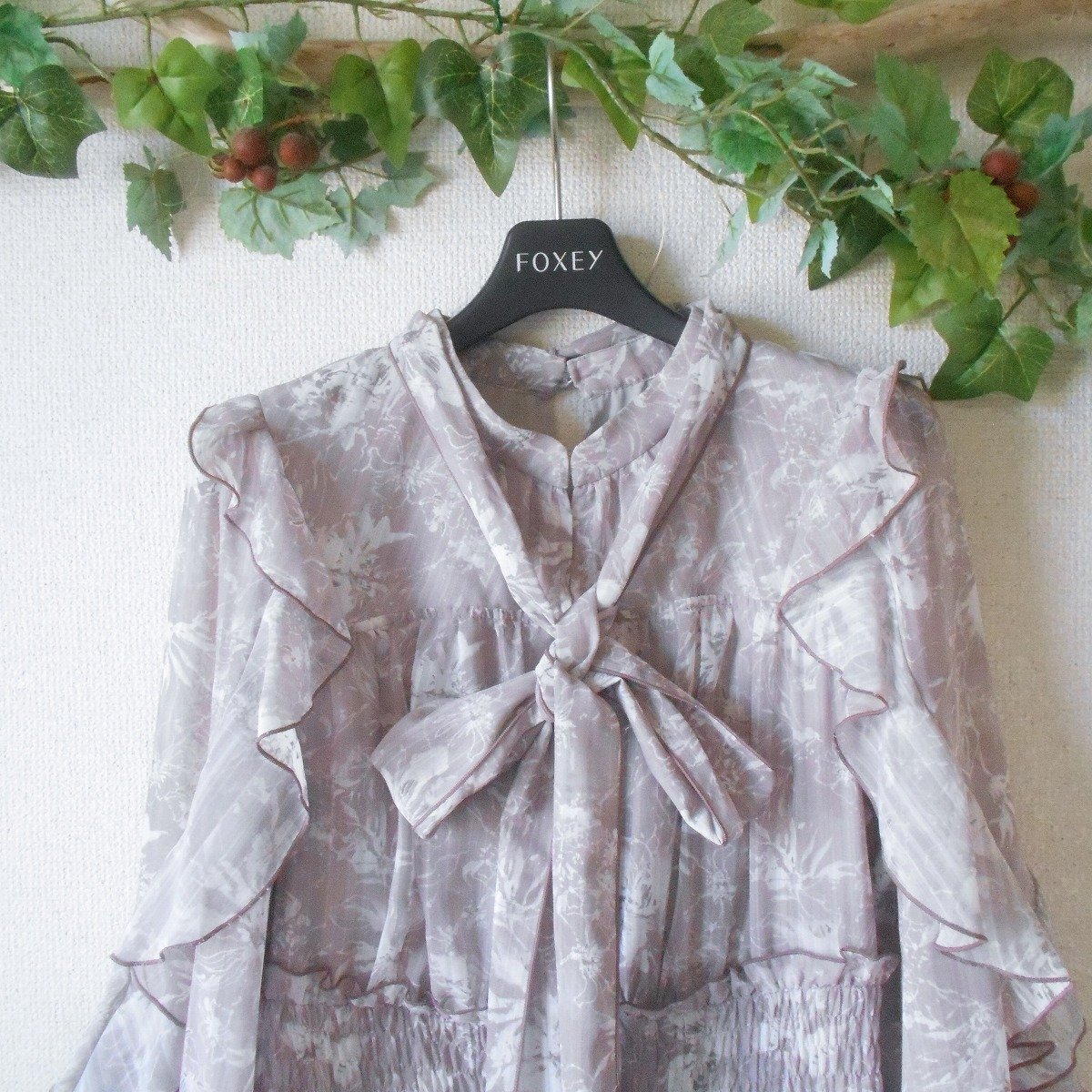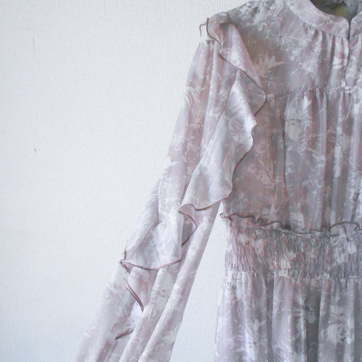 【ポイント】アプワイザーリッシェのワンピースになります。お色は少しパープル混ざりのベージュ系で春夏を中心に着ていただけるお品です。ネックにはリボン、お袖にはフリルが使用された、とっても素敵なデザインです。