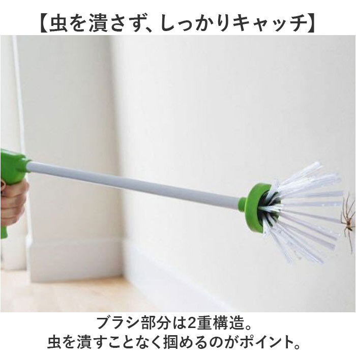 商品説明 | ・・【厄介な虫の回収に役立つアイテム】 ・退治後の回収ができない、逃せない時に!「虫とりスティックキャッチャー 触らずとれる」。 ・【誰でも簡単に使えるシンプル設計】 ・キャップを取ってグリップを握ると、先端のブラシが開く仕組み。いざという時もサッと使える◎ ・【虫を潰さず、しっかりキャッチ】 ・ブラシ部分は2重構造。虫を潰すことなく掴めるのがポイント。 ・【用途いろいろ、マルチに活躍】 ・虫以外にも、お掃除の際のゴミ取りや土いじりなどにも重宝。 ・【設置しやすい収納パーツ付き】 ・フックと接着両面テープが付属。壁に立てかけたり、いつでも取りやすい位置に。 |