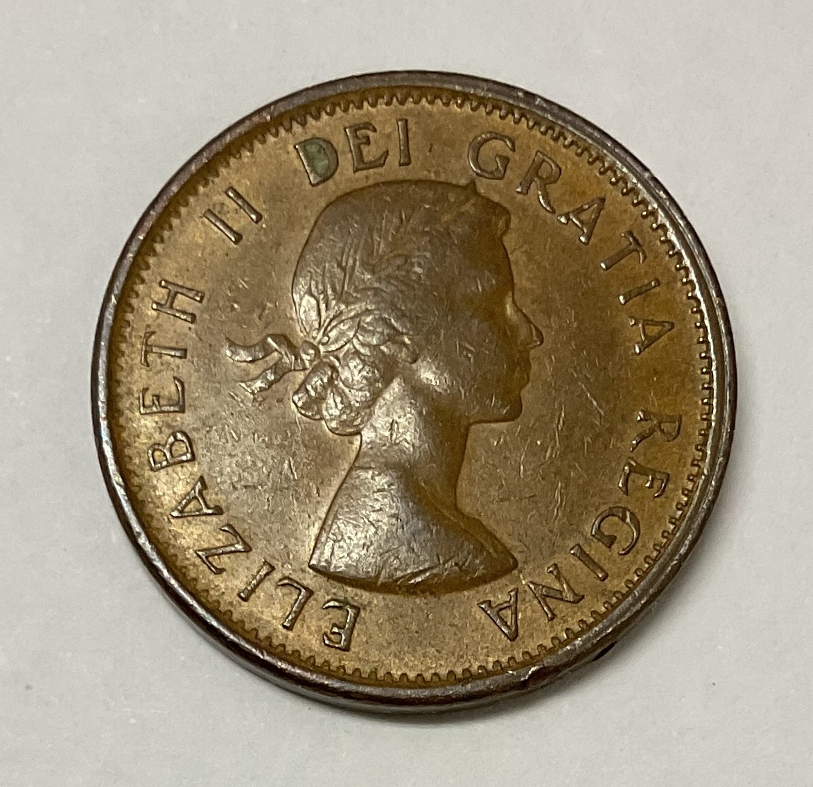 1962年発行 カナダ1セント硬貨 エリザベス2世の肖像とカエデの葉のデザイン です。