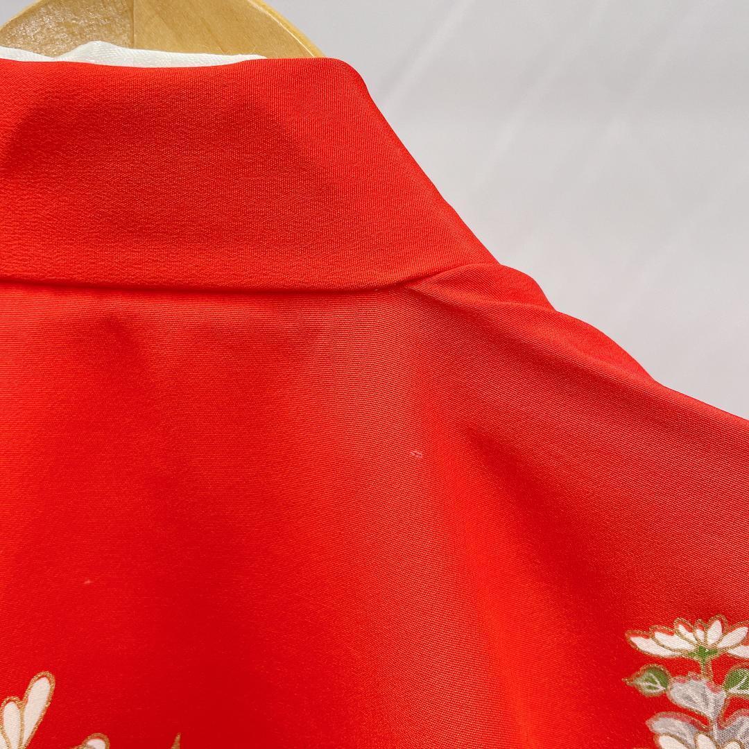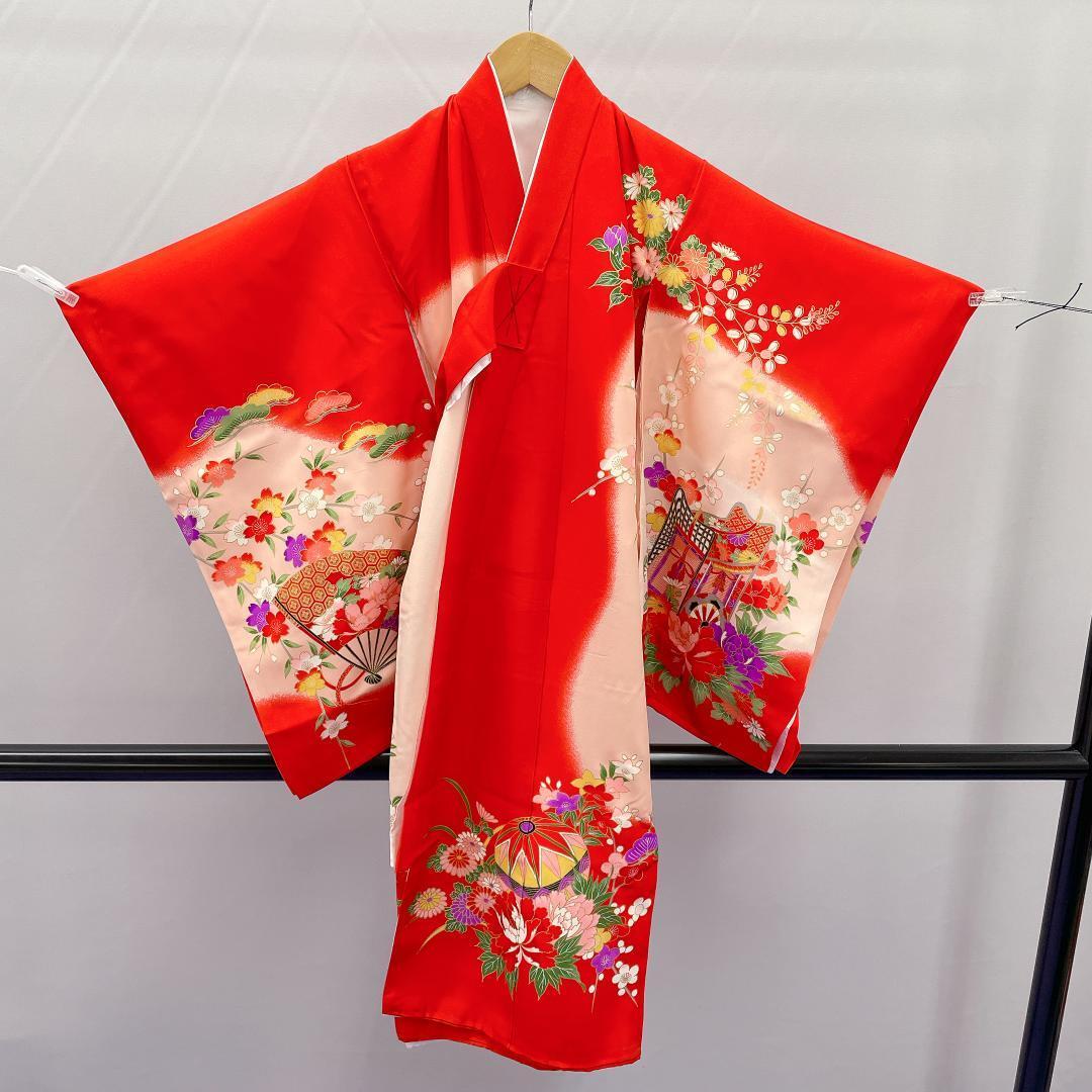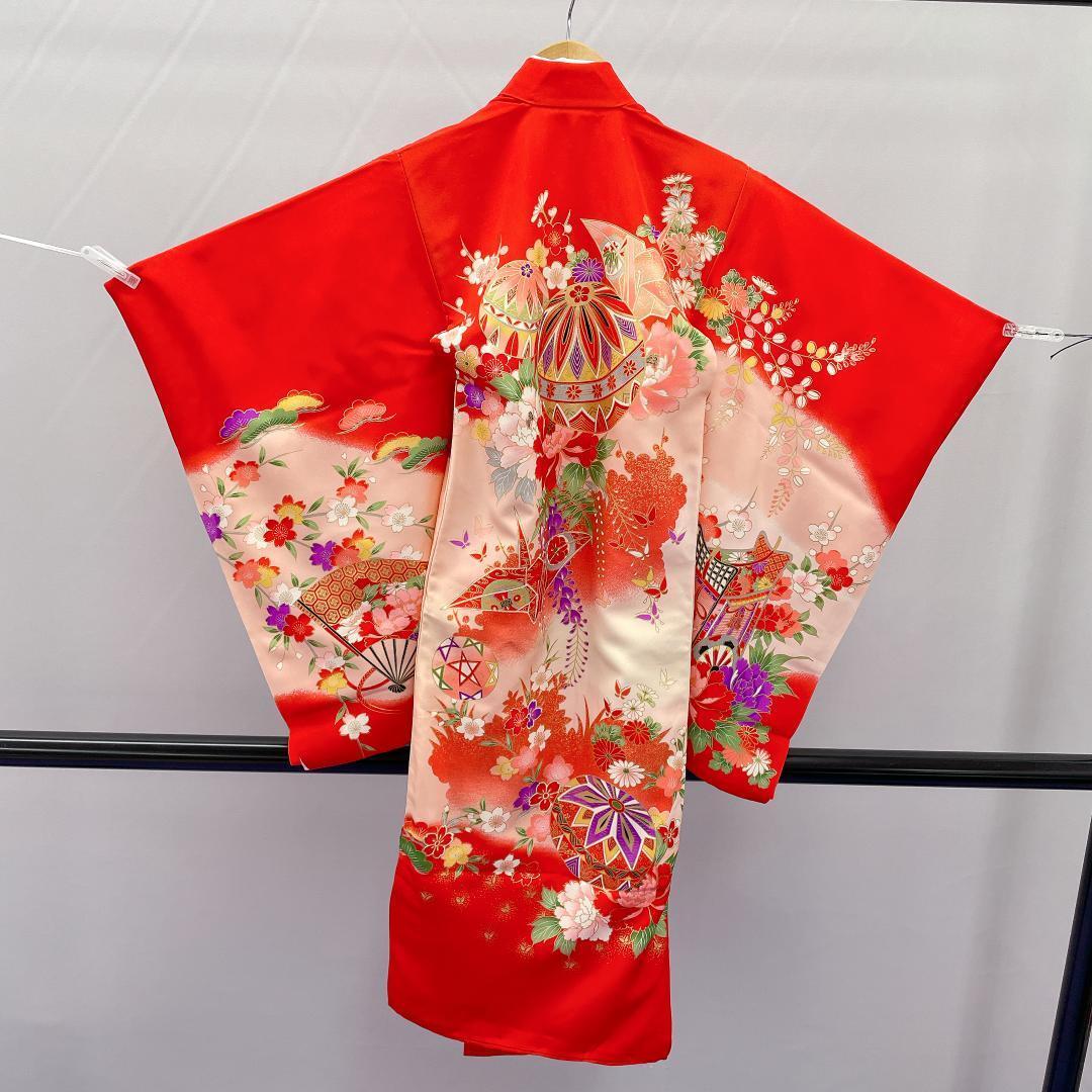 着物の色は、赤みの強い朱色~淡いピンク色に、古典的な花柄です。