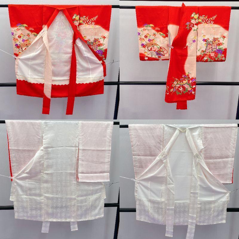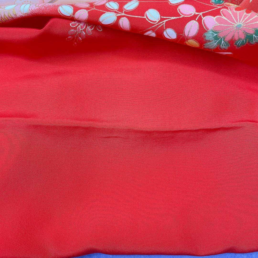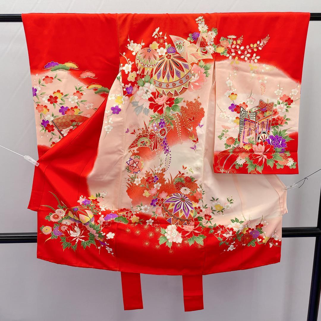着物の色は、赤みの強い朱色~淡いピンク色に、古典的な花柄です。
