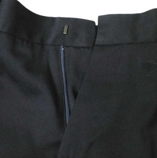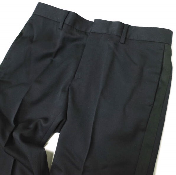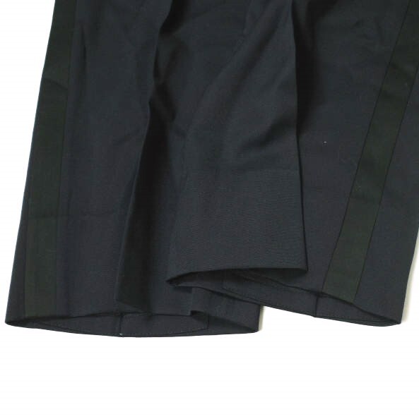 ネイビーのウール地にブラックカラーのサイドラインを施したノープリーツスラックス。