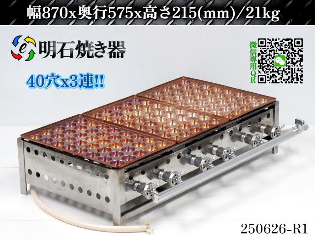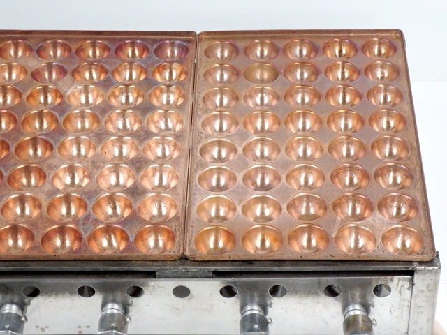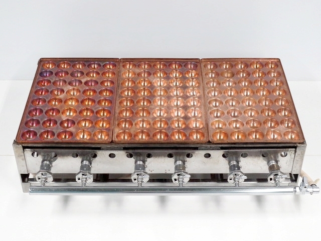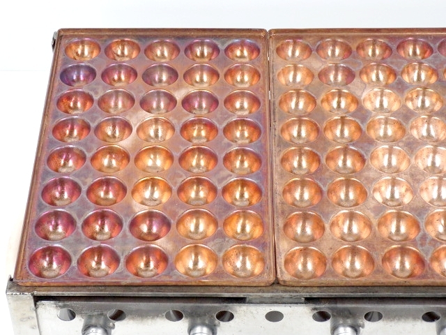 | 【商品説明】 ★兵庫県明石市の郷土料理『明石焼き』が作れる特注の純銅製型を使用。 ★高級な銅を使用した特注銅板は驚くほどの熱伝導率があり『旨味』『香り』『触感』をより引き出します。 ★直径約5cmの明石焼きが生産できます。 ★銅板1枚につき40個の明石焼きが作れるので、最大120個生産できます。 【状態:中程度★★★☆☆】 『◎』保証期間:商品到着から1週間。 『※』商品ご到着日から7日間に限り初期動作不良に関してのみ対応させていただきます。 『※』1週間以降に発生した不具合についてはご自身で解決なさってください。 『◎』[ガス接続][加熱動作][銅板加熱状態][動作音]において正常に動作しました。 『△』中古品につき[すり傷][熱変色跡][シミ]等の経年の使用感が見受けられます。 『※』写真に載せきれない部分にも上記と同様の使用感がございますので予めご了承ください。 『商品詳細』