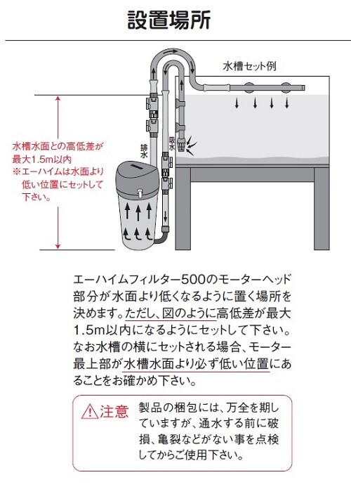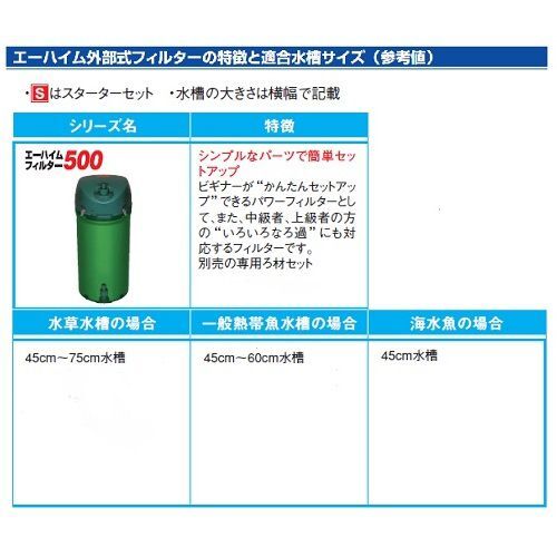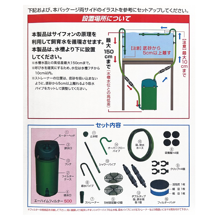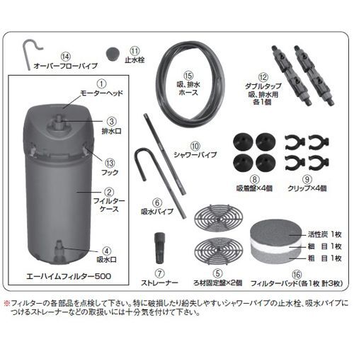 | セット内容 | モーターヘッド・フイルターケース・排水口・吸水口・ろ材固定盤(2個)・吸水パイプ・ストレーナー・吸着盤(4個)・クリップ(4個)・シャワーパイプ・止水栓・フック・ダブルタップ(吸・排水用各1個)・オーバーフローパイプ・吸/排水ホース・フィルターパッド・(活性炭1枚/細目1枚/粗目1枚) |