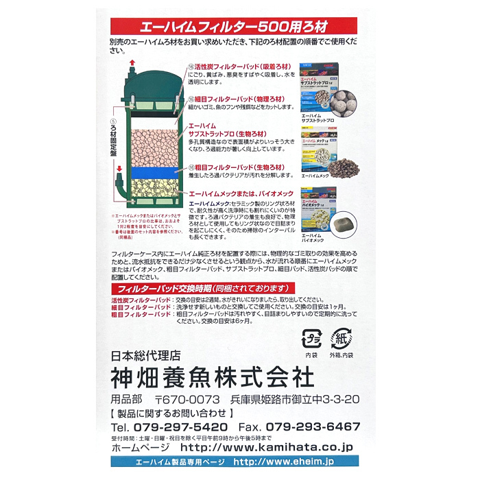 | 付属ろ過材 | 活性炭フィルターパッド(1枚)・ 細目フィルターパッド(1枚)・祖目フィルターパッド(1枚) |