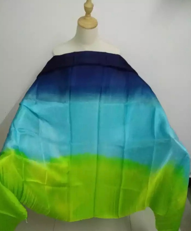 華やかで高品質な100%シルク製のベリーダンス用ベールです。ロイヤルブルー、ブルー、グリーンの美しいグラデーションが神秘的な輝きを放ちます。コンテストやダンスショー、舞台出演、ワークショップなどあらゆるパフォーマンスシーンに最適です。動くたびに優雅に舞い、観客の視線を惹きつけるこのベールは、高級感あふれる素材感がダンサーの魅力を引き立て、ステージでの存在感をアップさせます。シルク製品は水に弱いため、直接水に触れないようご注意ください。洗濯は避け、必要に応じてスチームアイロンで丁寧にお手入れしてください。繊細な素材のため、特に経験豊富なベリーダンサーの方におすすめします。美しい色合いと質感が、あなたのダンスに華やかさと深みを与えます。特別なパフォーマンスや練習、イベントにもぴったりな一品です。ぜひ、このシルクベールであなたの表現力をより豊かに彩ってください。