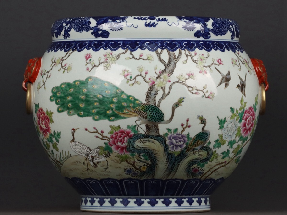 【瓏】陶磁器 青花加彩塗金百鳥朝鳳紋 獣耳缸 大清乾隆年製 染付 置物擺件 古賞物 古美術 陶芸 蔵出