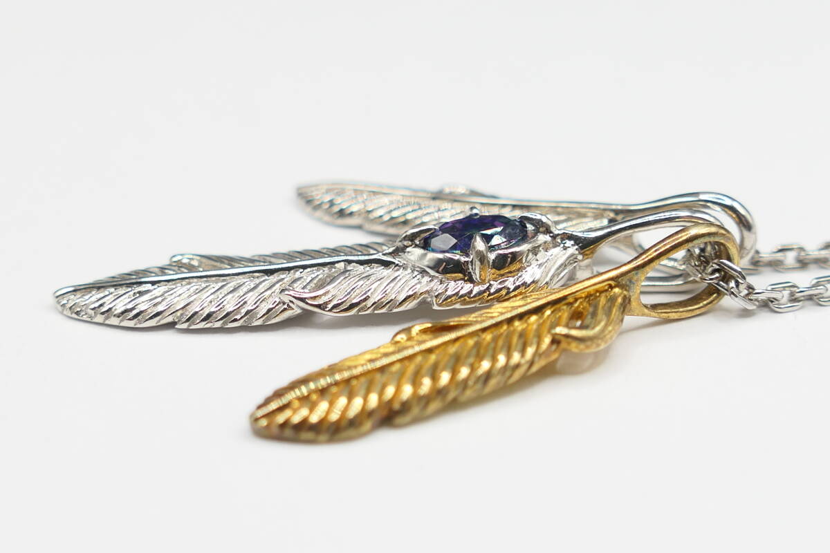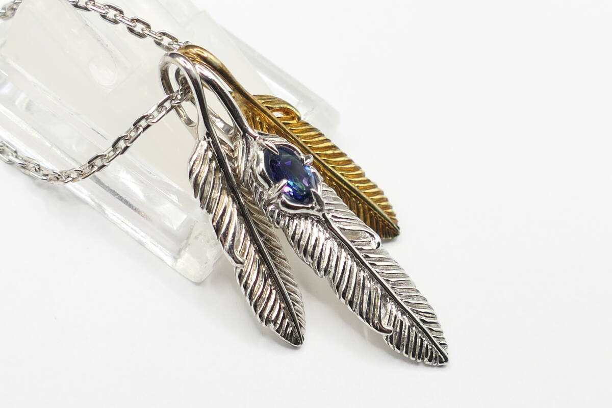 繊細で躍動的な彫りこみのフェザーデザインで、一つのフェザーには光によって輝きが変わる魅惑的なミスティックトパーズをセット。