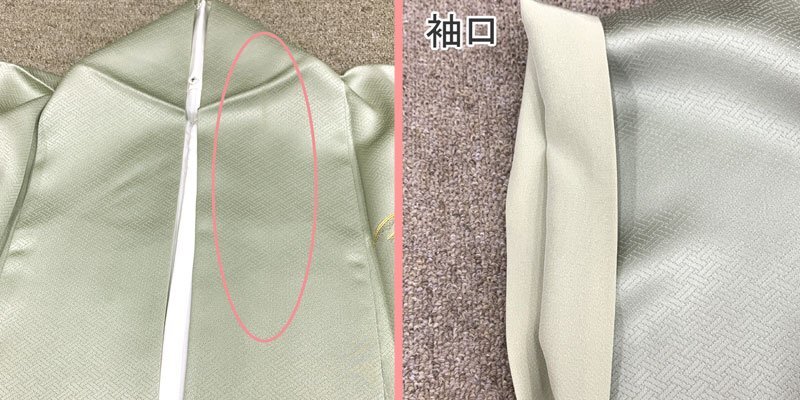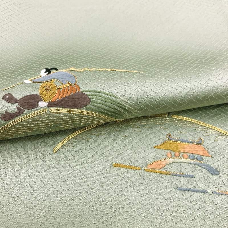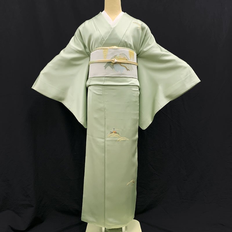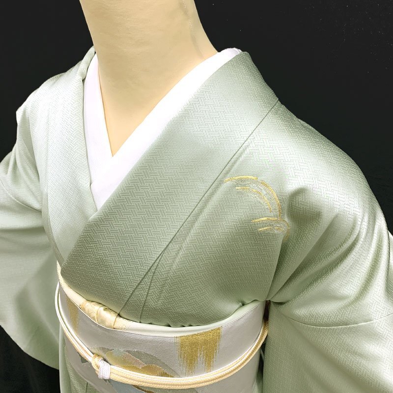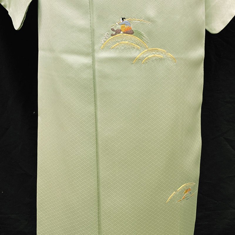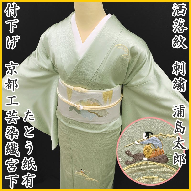 | 〇京都工芸染織宮下 付下げ 刺繍 浦島太郎 洒落紋 金駒刺繍 たとう紙付き〇美品 (No.ed) 京都工芸染織、宮下取扱い。網代崩し文様の地紋が浮かび上がるややくすんだ淡い緑色の地に、浦島太郎と竜宮城の刺繍が施された付下げです。「蔦」の洒落紋がございます。京ごふく宮下のタグ、画像のたとう紙がございます。 (画像の帯412mn6や小物は参考商品で、本品には含まれません) 衿山と袖口に薄っすら使用汚れがございますが、着用の際は隠れる部分です。 【表地素材】正絹 【色】ややくすんだ淡い緑 *モニターによって色味は実際と異なる場合がございます。 【サイズ】裄:67.5cm、丈(肩から):167cm、袖幅:34cm、袖丈:49cm、前幅:24.5cm、後幅:28.5cm、裄の縫込み 身頃側:1cm、お袖側:1cm、内揚げ幅:3.5cm *素人採寸のため、多少の誤差はご容赦ください。 上質な逸品ですので、いかがでしょうか?よいお品物でお勧めです^^ | |