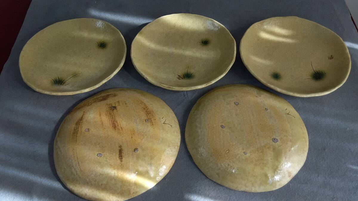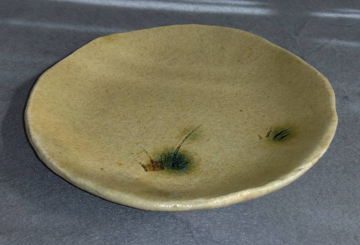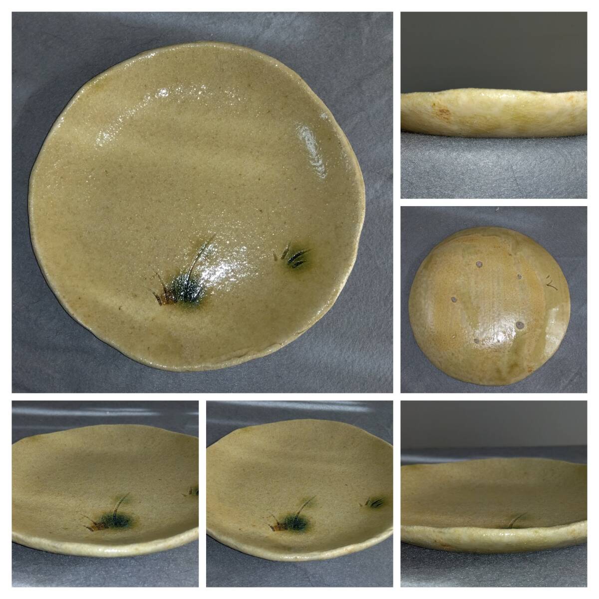 美濃焼の名工 大嶋久興 【子の日窯】黄瀬戸「油揚げ手」希少美品 中皿 5枚セット 黄瀬戸中皿は きわめて瀟洒(しょうしゃ)な味わい深い雅陶の胆礬(タンパン:硫酸銅の釉で、緑色になる)で彩られた見込み部の線刻草文様が 施釉後の効果を際立たせて 師を【悪戦苦闘の毎日】と言わしめる「油揚げ手」黄瀬戸中皿ならしめています。 師の卓越した面取りそぎ落とし技が昇華し類を見ない黄瀬戸釉薬調合の下素晴らしい気品あふれる深みと透明感のある黄瀬戸色を際立たせています。 これら安土桃山伝統美紋様は 極上至福のひと時をもたらし 無限の幽玄美/崇高美おも感じさせる心和む風趣を醸し出しています。 器に盛られたどんな料理も高級料亭の味へと昇華し 安土桃山時代の陶芸家魂を綿々とうけつぐ無限の幽玄美/崇高美をも感じさせる心和む時空を超えた悠久の流れをご堪能下さい。 黄瀬戸中皿サイズ: 口径180/185㎜ 全高25/28mm 見込み16/18mm底30mm 大嶋久興師作陶に思う事 【黄瀬戸中心の仕事をしておりますが、織部、粉引き等その他の焼き物にも興味があります。 黄瀬戸は今もわからない事ばかりで悪戦苦闘の毎日です。少し派手目で気持ちのよい色合いが出せればと思っております。 派手な所と地味な面を持つ不思議な焼き物が黄瀬戸の一面であると思っております。大嶋久興】