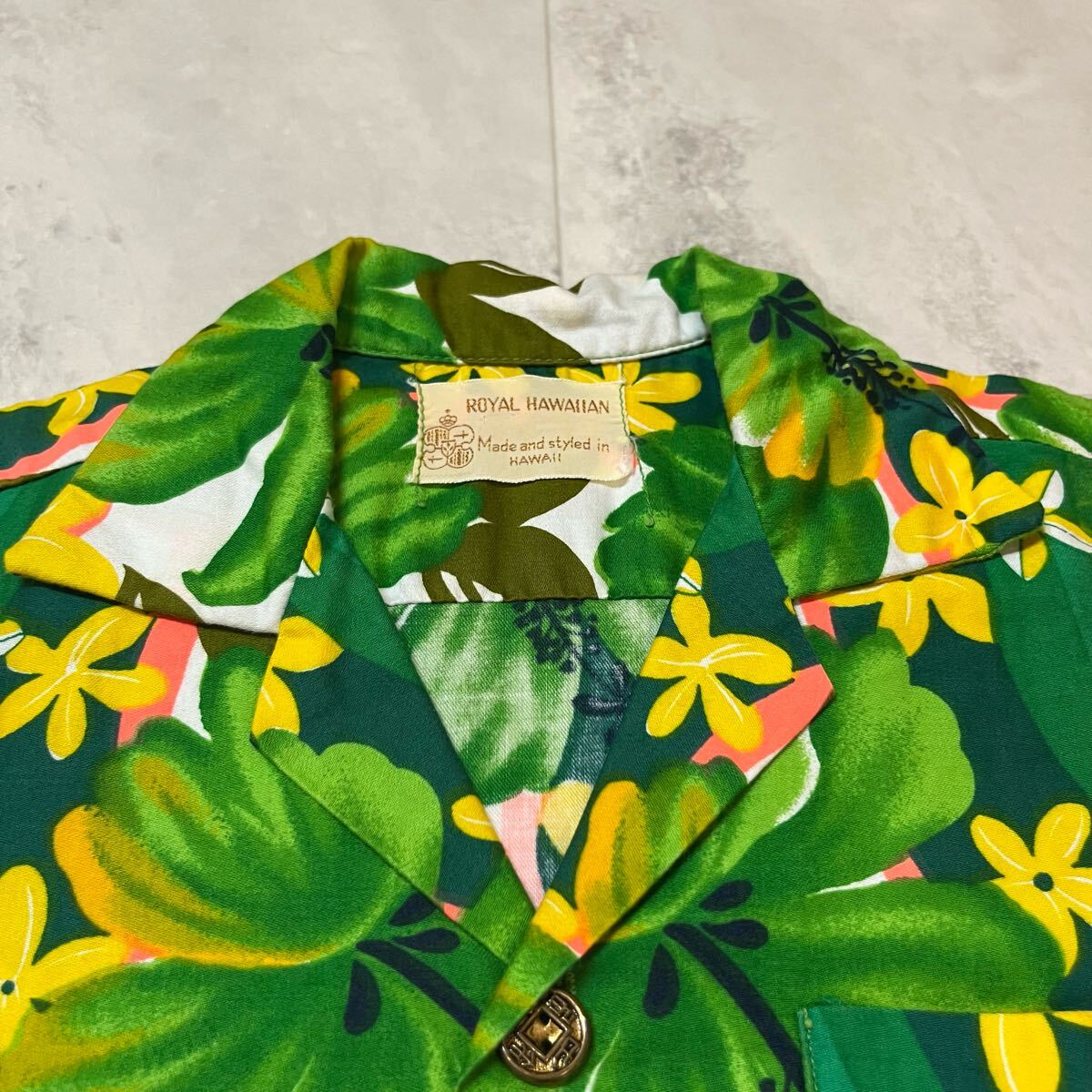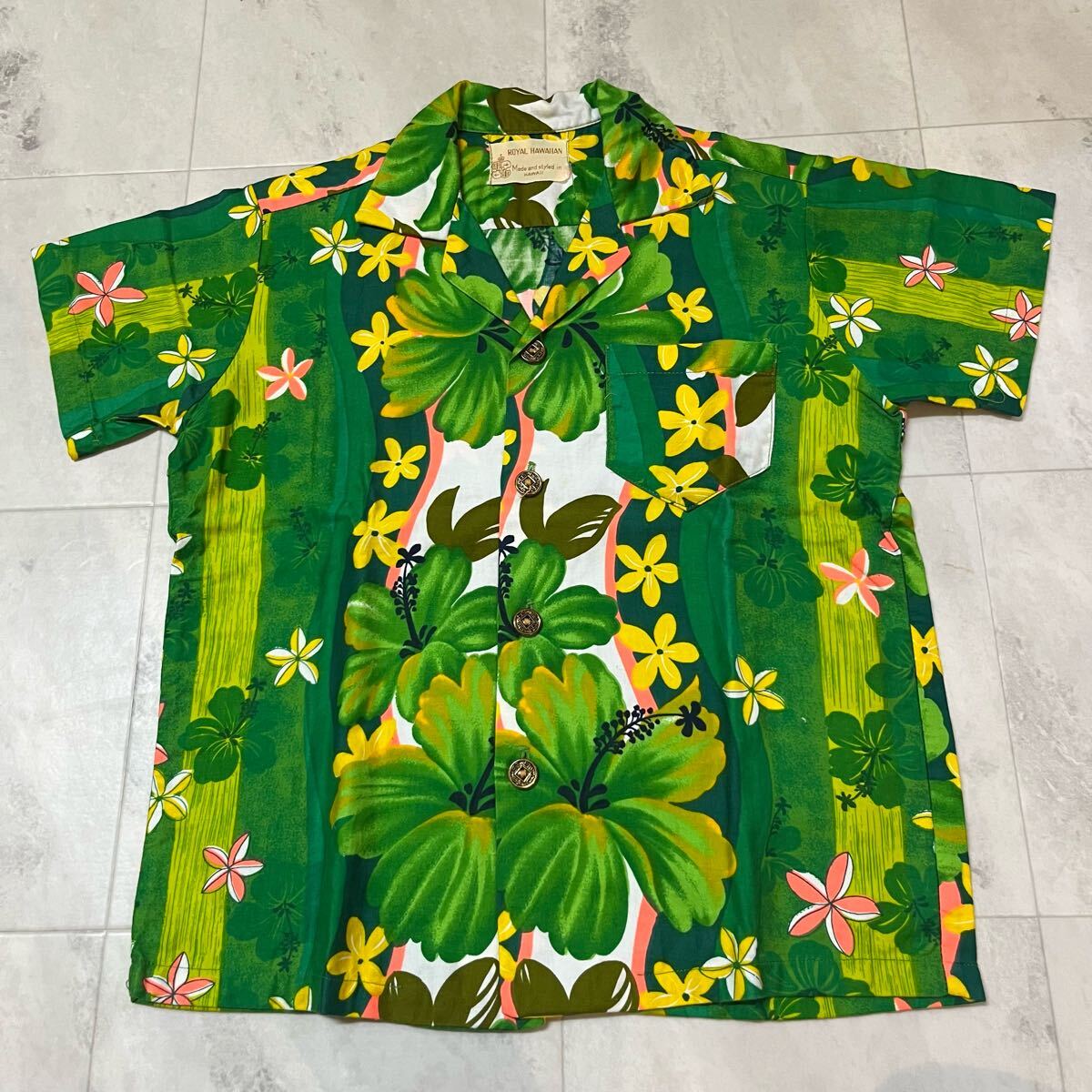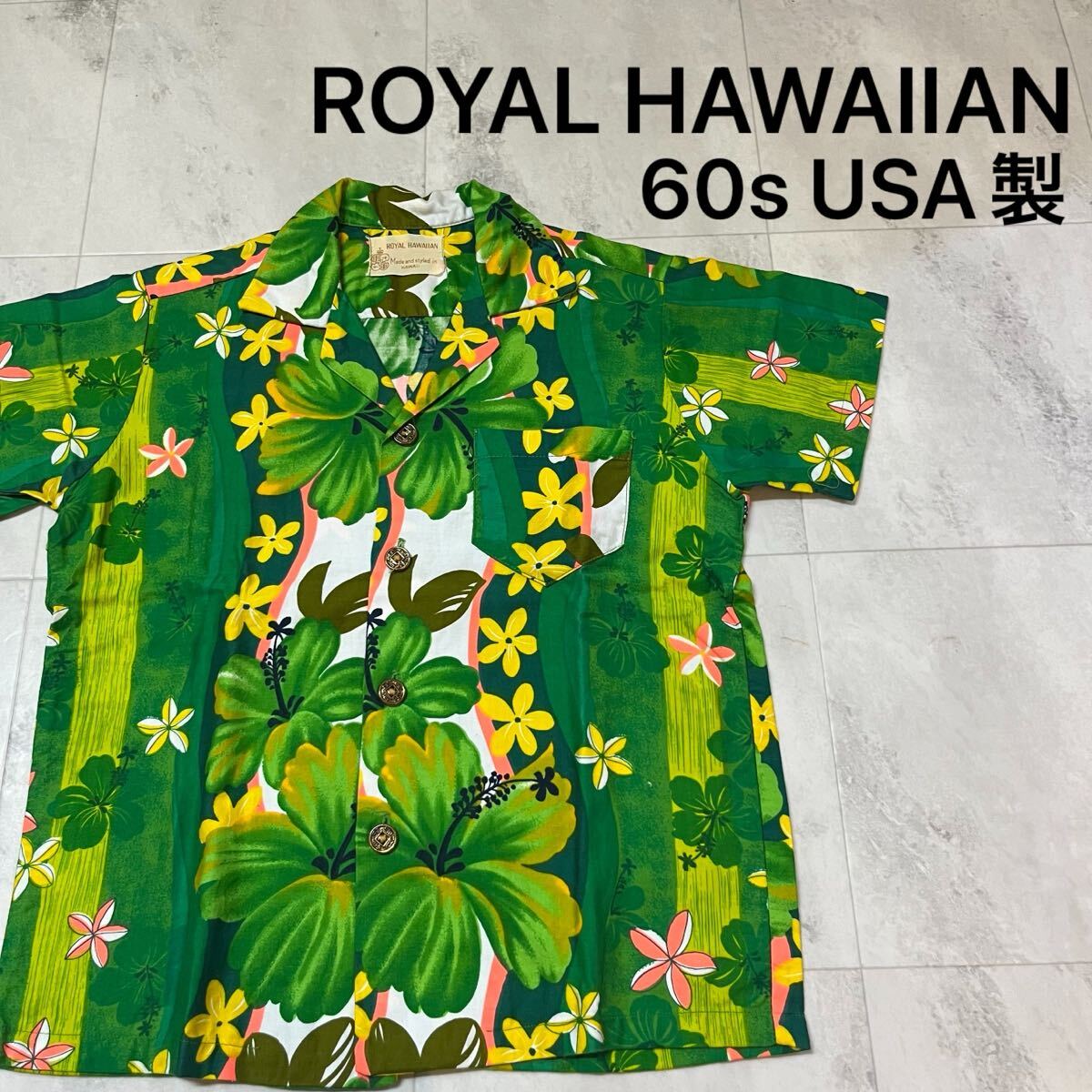 60s USA製 ROYAL HAWAIIAN ロイヤル ハワイアン アロハシャツ メタルボタン 古銭ボタン ヴィンテージ コットン ハイビスカス 玉mc3868