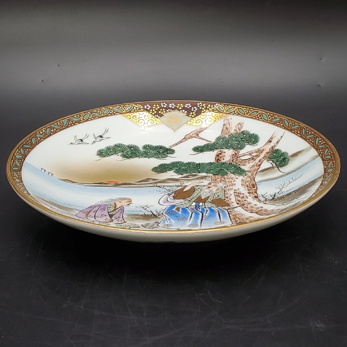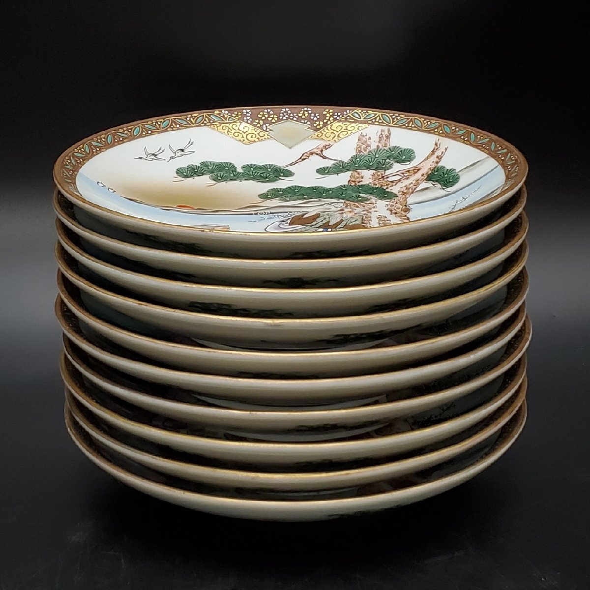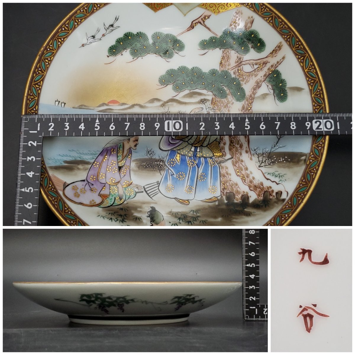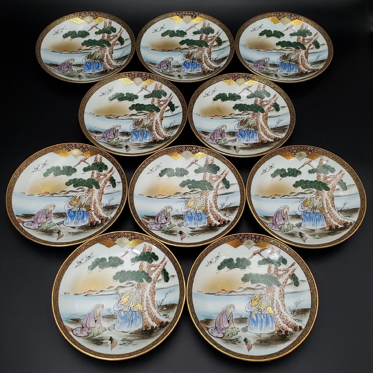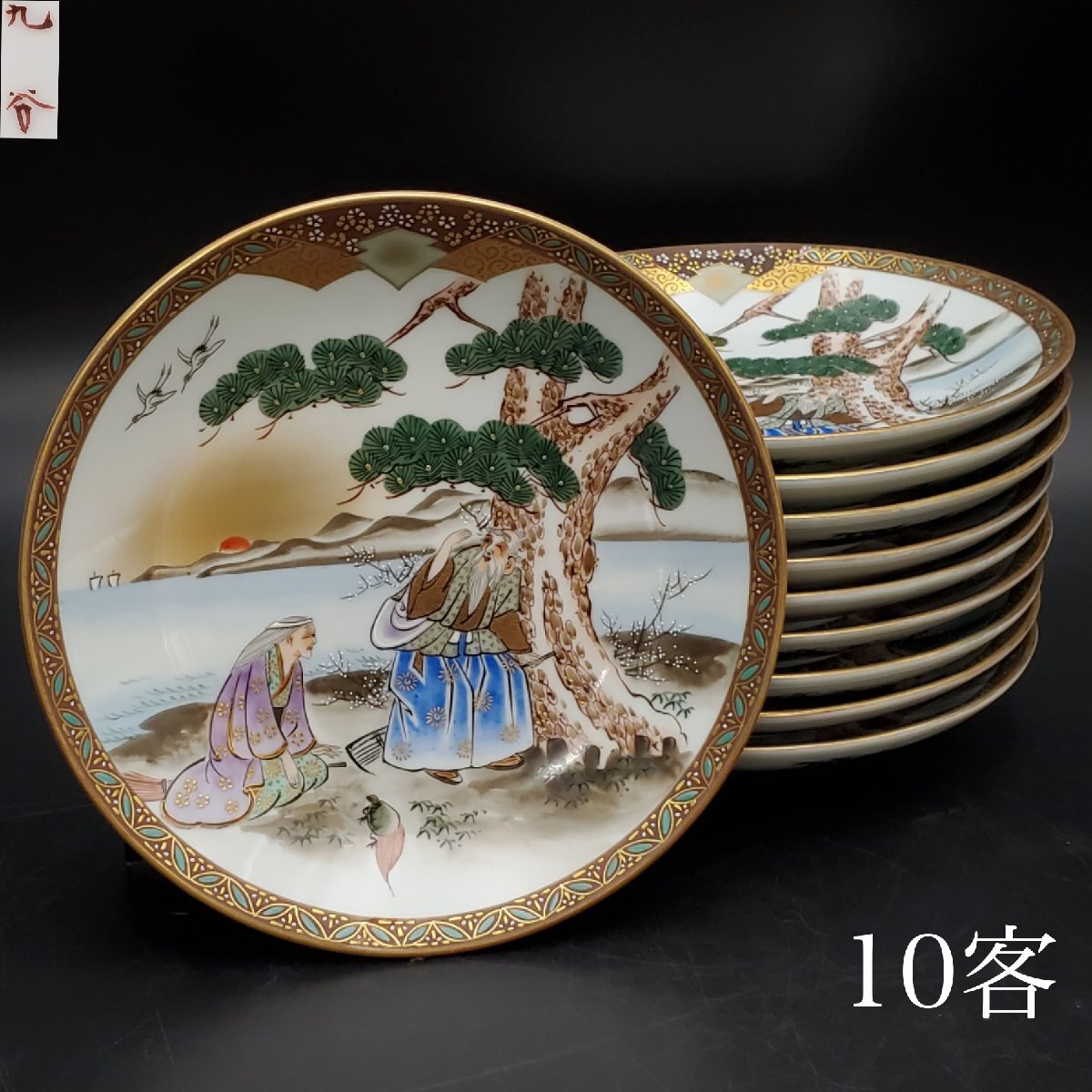 【宝蔵】九谷焼 金彩色絵鶴亀高砂図 銘々皿 10客 約20.5cm 時代物 ①