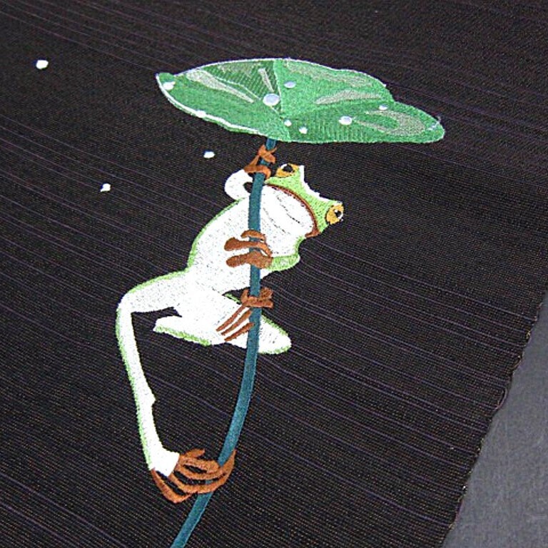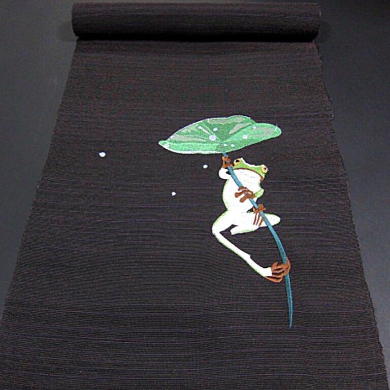 スリーシーズン 新品未仕立 西陣織刺繍九寸名古屋帯 カエル 蛙 焦茶