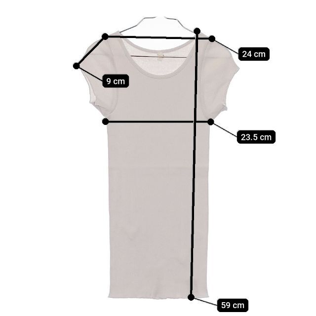 | 実寸サイズ | 肩幅:約24cm 着丈:約59cm 身幅:約23.5cm 袖丈:約9cm ※記載以外のサイズが合わないことを理由とした返品はできませんので、 記載部分以外で実寸サイズの気になる箇所があれば必ず購入前にご質問ください。 |