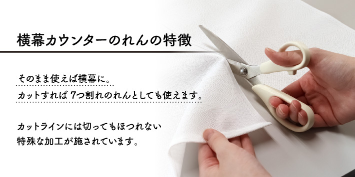 割れについて:割れ目のないのれんです。縦に6か所ございますカットラインに沿ってハサミで切り込みを入れることもできます。