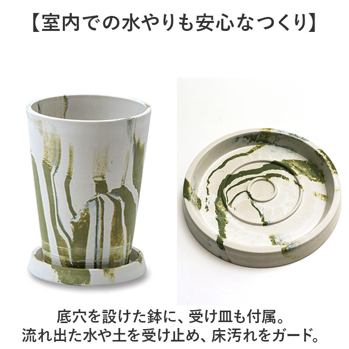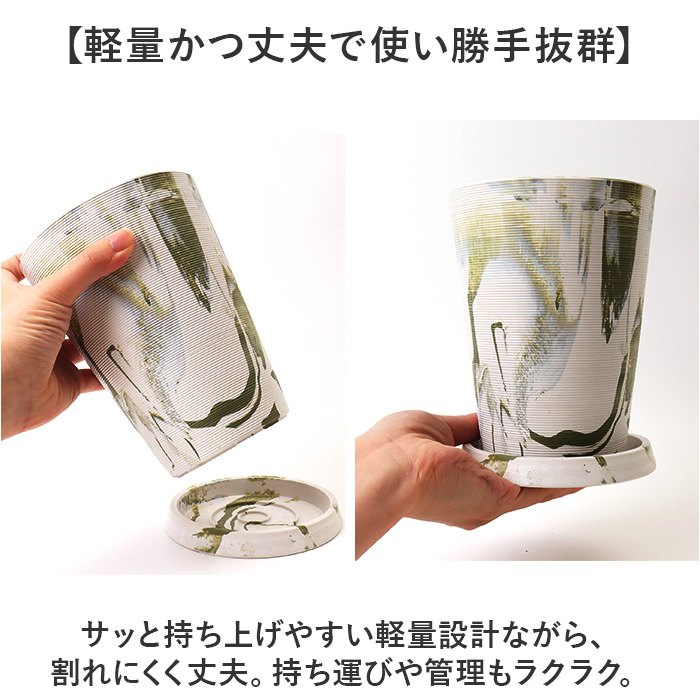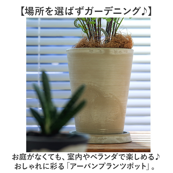 | 商品説明 | ・・【場所を選ばずガーデニング♪】 ・お庭がなくても、室内やベランダで楽しめる♪おしゃれに彩る「アーバンプランツポット」。 ・【環境にも優しいリサイクル素材】 ・廃棄物のおがくずと、石粉をリサイクルプラスチックに混ぜ合わせて作られたポット♪ ・(※)素材の特性上、色の出方やムラなど個体差がございます。 ・【軽量かつ丈夫で使い勝手抜群】 ・サッと持ち上げやすい軽量設計ながら、割れにくく丈夫。持ち運びや管理もラクラク。 ・【室内での水やりも安心なつくり】 ・底穴を設けた鉢に、受け皿も付属。流れ出た水や土を受け止め、床汚れをガード。 ・【植物とお部屋をコーディネート】 ・シンプルなワンカラーやオリジナリティ溢れるマーブルカラー☆素材を生かしたマット仕上げ。 |