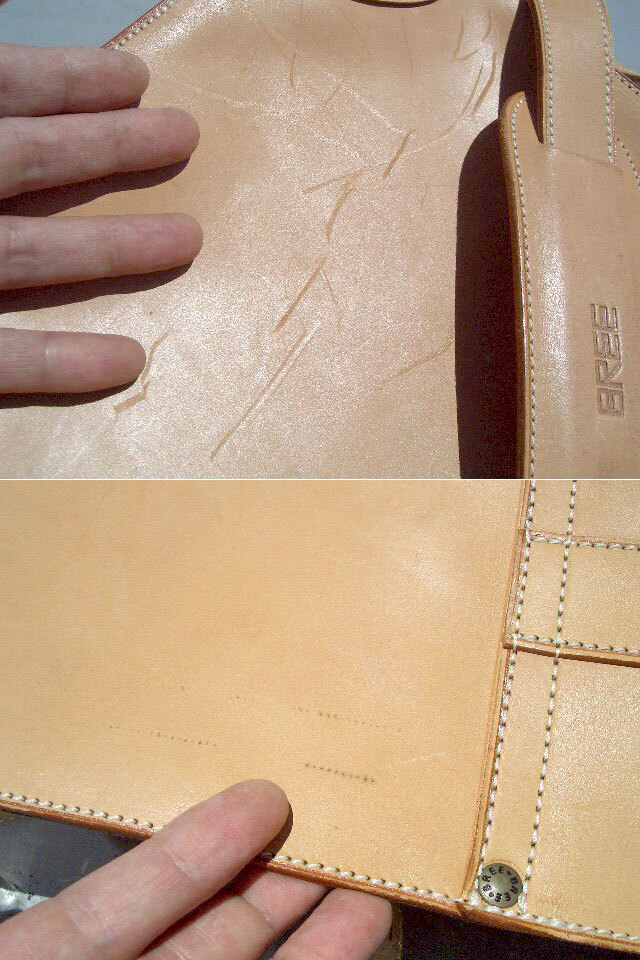 素染めのヌメ革の素材個性のヤケ:薄いシミ:多少のスレがあります。【映像参照】