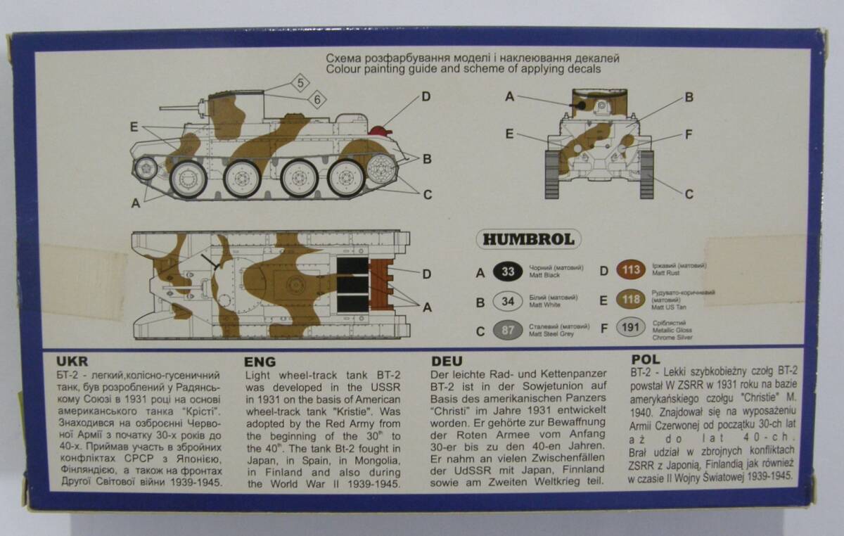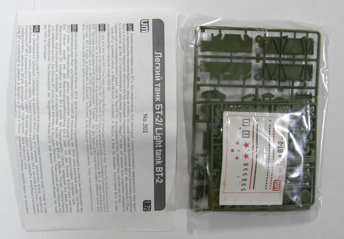 | 【商品説明】 ・商品名称:BT-2 快速戦車(1/72スケール 302) ・ブランド:UM ユニモデル ・発売日:2002年 ・「UM ユニモデル」製「BT-2 快速戦車 37mm砲搭載型」の1/72スケールキットです。2002年に販売されたもので、初版は同年に同社より「BT-5 後期型」として販売されました。その後、2020年代までにデカールやパーツ、パッケージの差し替えなどにより、以下の12車種が計21種類のパッケージで販売されました。 ①「BT-2 37mm砲搭載型」 ②「BT-2 機銃搭載型」 ③「BT-5 初期型」 ④「BT-5 後期型」 ⑤「BT-5 試作火力支援車 RS-132航空ロケット弾搭載型」 ⑥「BT-5A / D-38 試作砲兵戦車」 ⑦「RBT-5 試作火力支援車」 ⑧「BT-7A」 ⑨「BT-7 1935年型」 ⑩「BT-7M / BT-8」 ⑪「BT-7 試作火力支援車 ロケット砲搭載型」 ⑫「BT-72」 ・全てキットの金型は「UM」社のものをベースとしており、初版以降の販売元は「UM」社、「UM Military Technics」社、「Bum」社、以上の3社になります(2025/7/4現在)。 <メーカーについて> ・「UM」社はウクライナの模型メーカーで、WWⅡの航空機と軍用車両、現用の軍用車両のキットを販売しています。航空機が1/48と1/72、軍用車両は1/35、1/48、1/72と幅広く、特に1/35は現用軍用車両や火砲、1/72スケールの軍用車両関係ではメジャーな車両から数台しか作られていない試作型などマイナーなものまで揃えており、マニア心をくすぐるラインナップとなっています。 <キットについて> ・パーツのモールドは繊細なものです。プラスチックの質についても、東欧系の簡易インジェクションメーカーにありがちな品質の低い再生プラスチックの使用による変形、変色、バリなどは殆ど見られません。 パーツはやや細やかな構成となっており、特に転輪部など足回りの組み立てに時間を要しますが、パーツの精度は比較的高めなので、根気よく取り組めば比較的早く車体の形になります。キットによっては細部の表現にエッチングパーツが用意されています。 商品ラインナップには派生型が多く展開しているので、コレクションにも最適です。 ・デカールは3車種分がセットされています。 <デカール> ・ソ連陸軍 1941年11月 World War 2 ・ソ連陸軍 District Militaire de Kiev 1935年 ・ソ連陸軍 District Militaire de Moscou 1934年