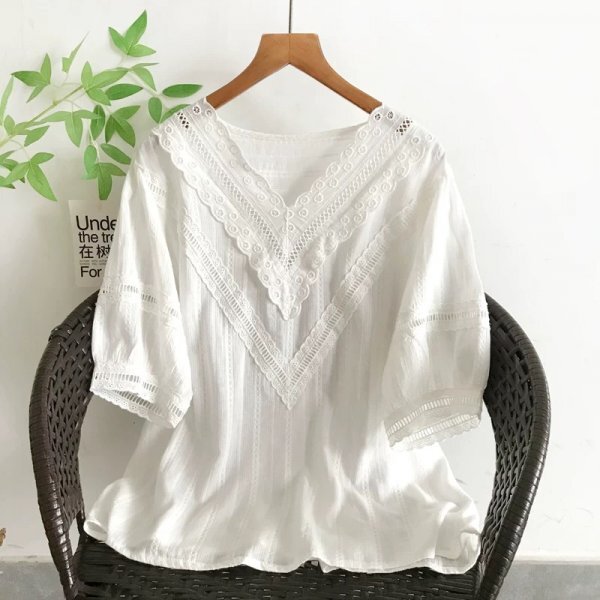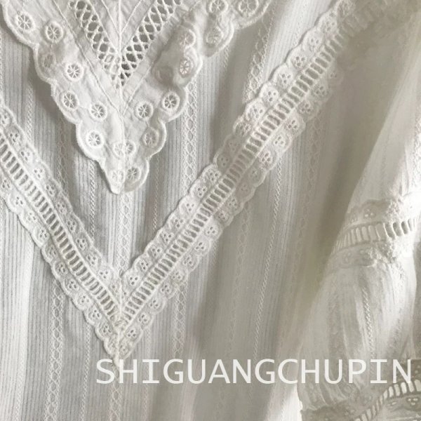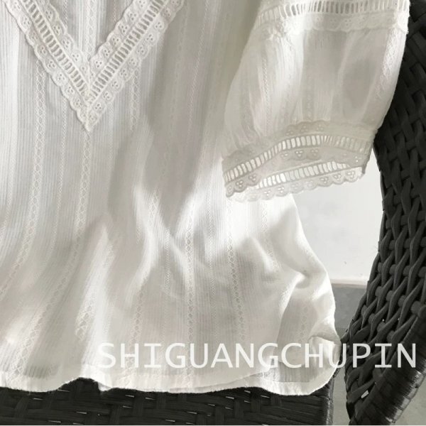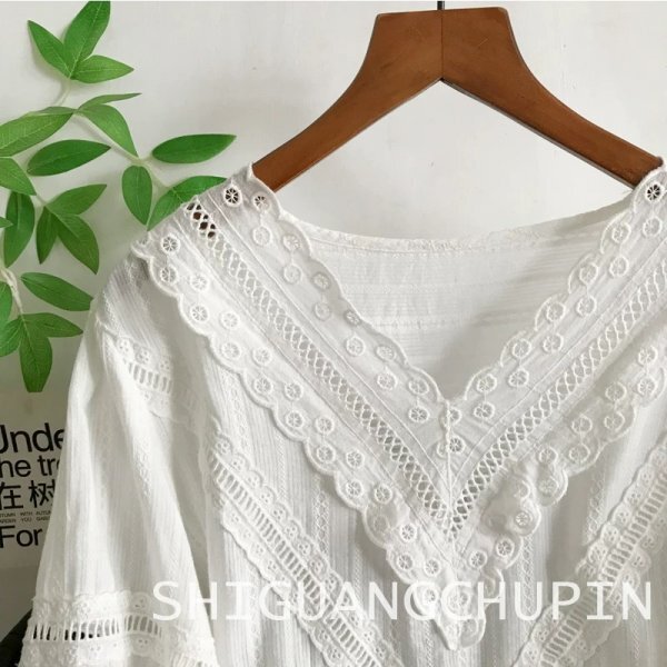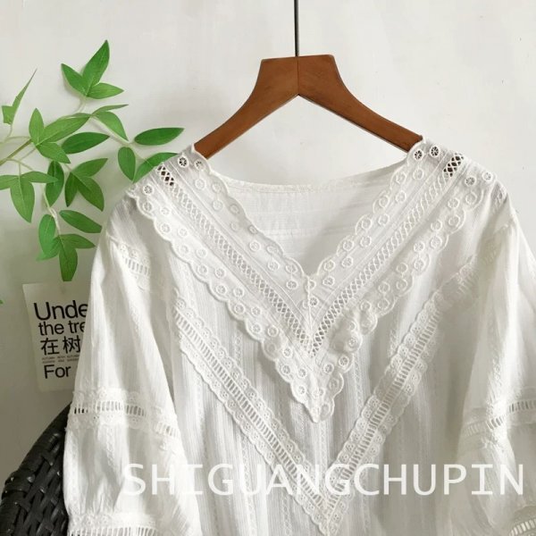 sg チュニック ワイシャツ 綿100% ゆったり レース Vネック オシャレ フリーサイズ ナチュラル 通気性肌触り抜群 サラサラ ホワイト