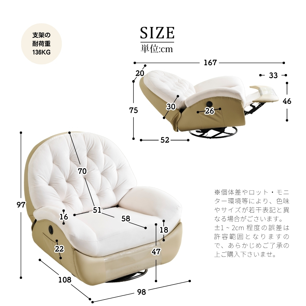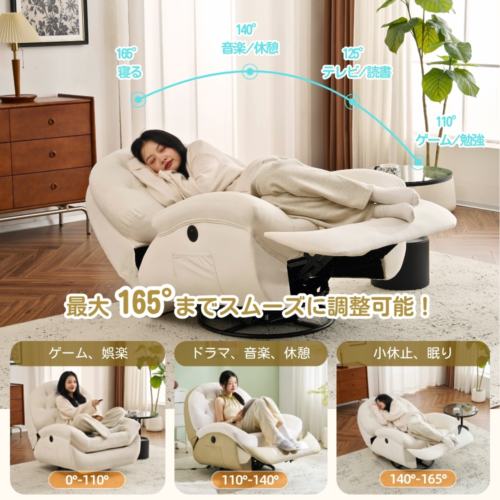 • 【調整可能なリクライニング機能】背もたれは105°-160°調整可能で、最適な角度にリクライニングできます。160°まで調整する場合は、腿部がゆっくり放置できます。身長150~175の方が横になるのは余裕です。そして、ソファーは前後揺れるだけでなく、270°回転もでき、リラックスしたいときや作業をしたいときに便利と楽をもたらします。